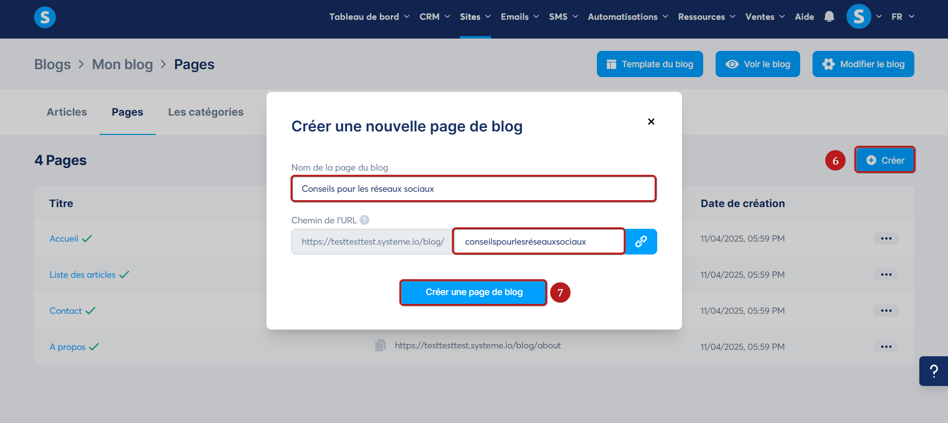 Une fois sur le menu de votre Blog, veuillez vous rendre en premier lieu dans la section Pages (3).