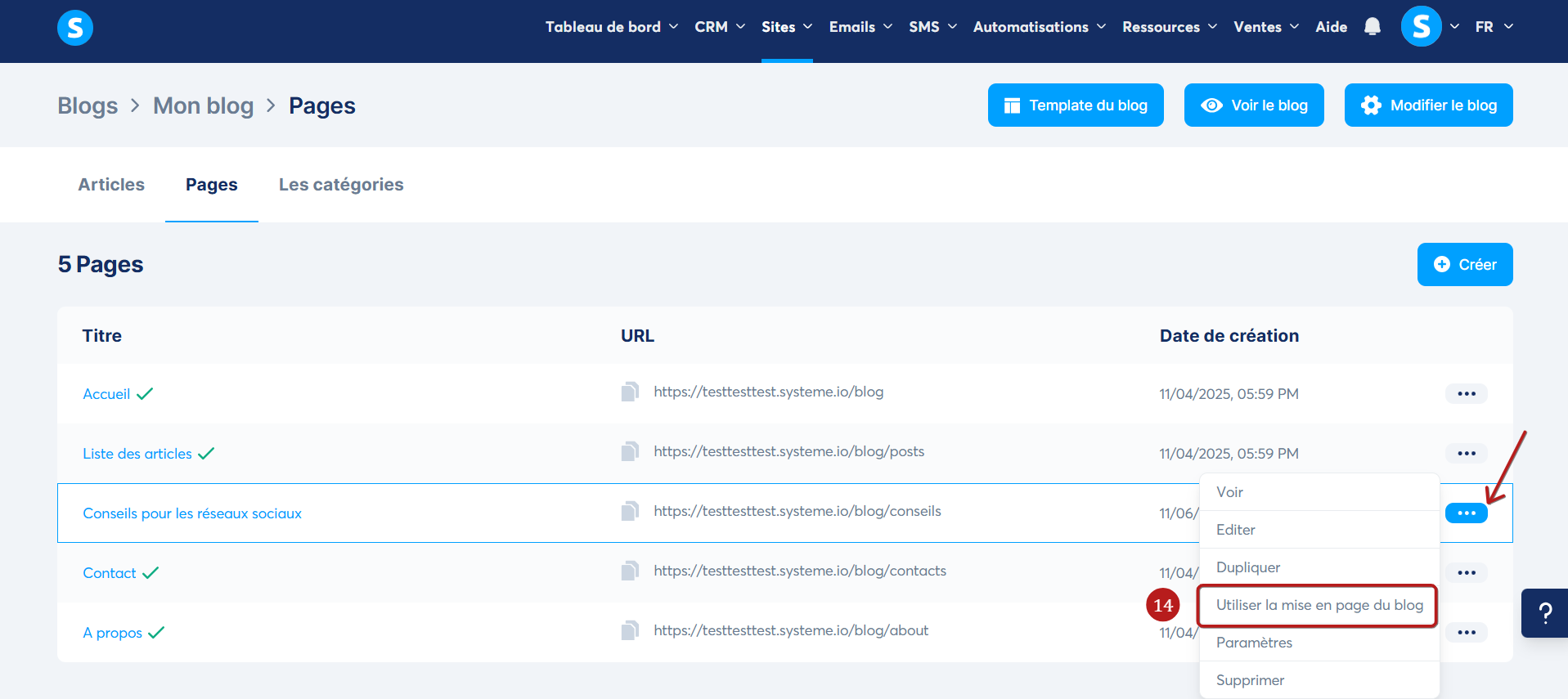 Il est possible de revenir à la mise en page du blog en allant dans les paramètres de la page et en cliquant sur l'icône Utiliser la mise en page du blog (14).