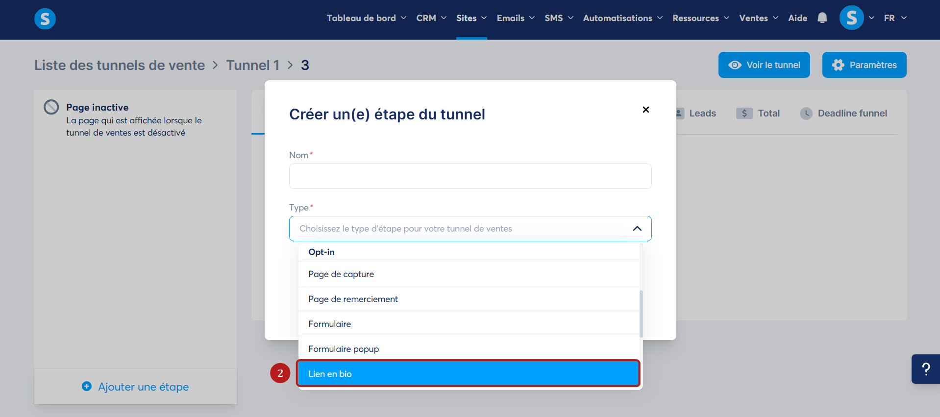 Puis choisissez "Lien en bio" dans le type d'étape du tunnel de vente (2).