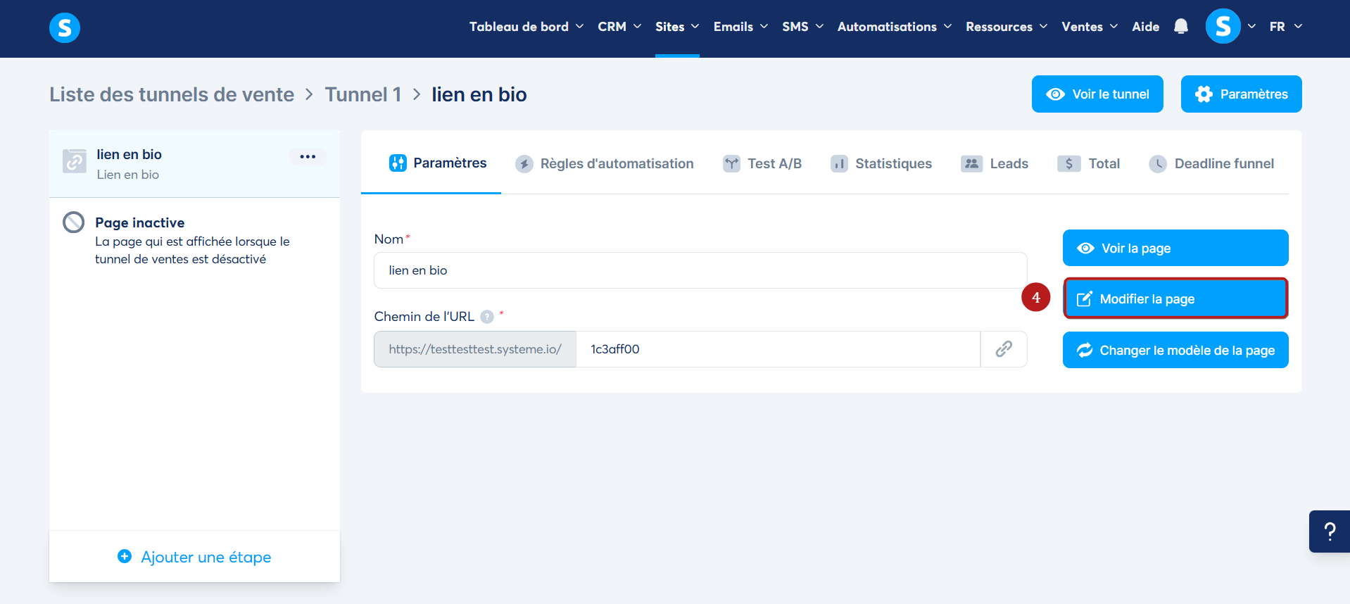 Rendez-vous dans le tunnel de vente sur lequel vous souhaitez ajouter la page. Dans le menu de gauche, cliquez sur "Ajouter une étape" (1).