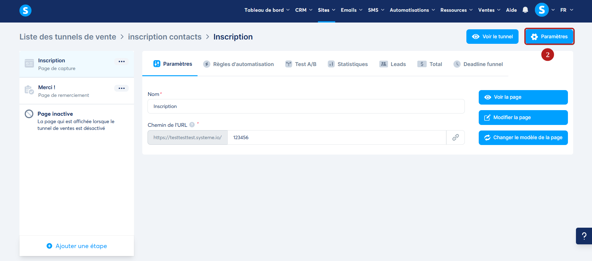 Cliquez sur l’un de vos tunnels de vente puis cliquez sur "Paramètres" (2).