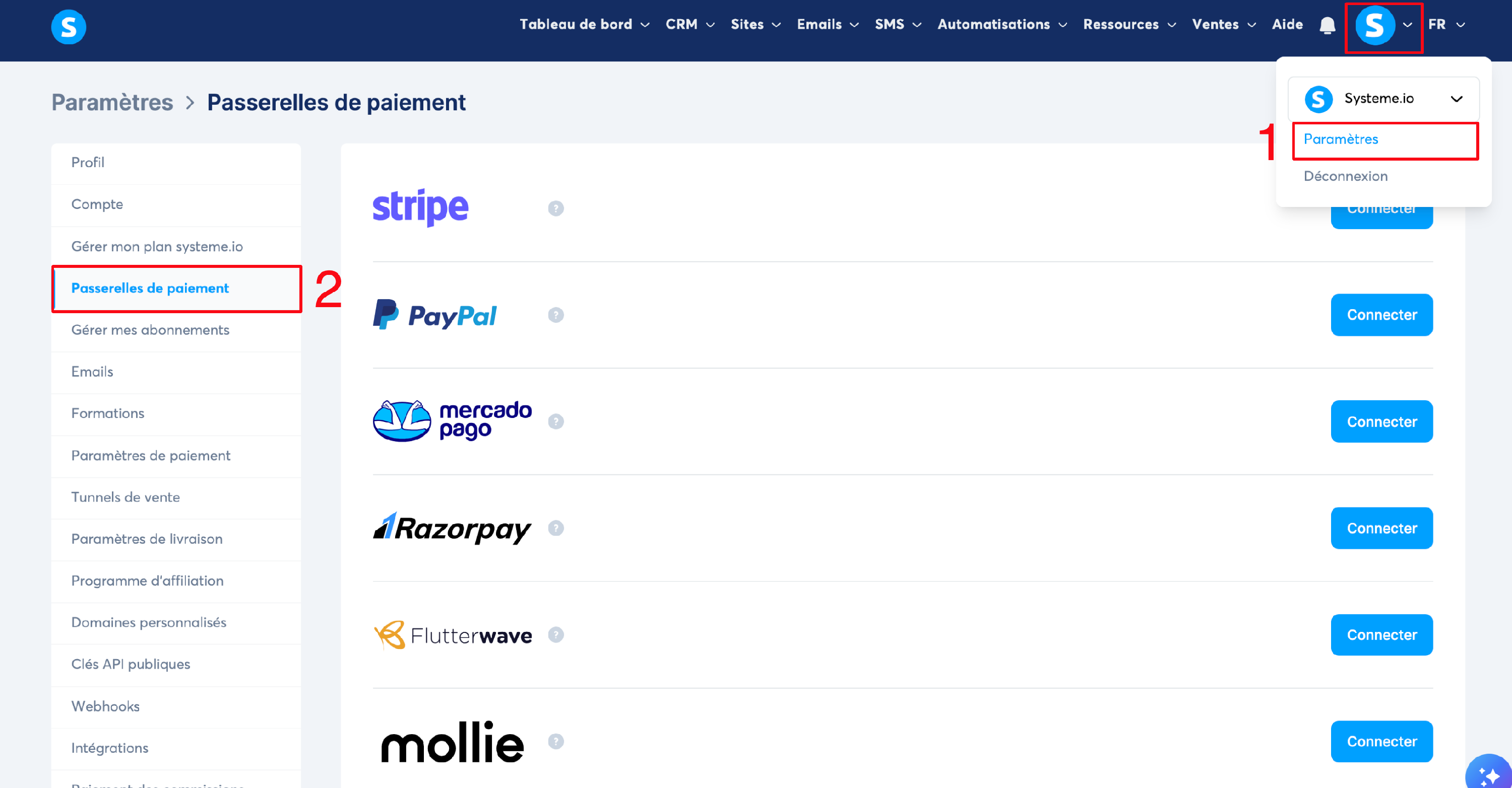 Pour ce faire, cliquez sur votre photo de profil, ensuite sur "Paramètres" (numéro 1 sur l'image), puis redirigez-vous vers "Passerelles de paiement". (numéro 2 sur l'image)