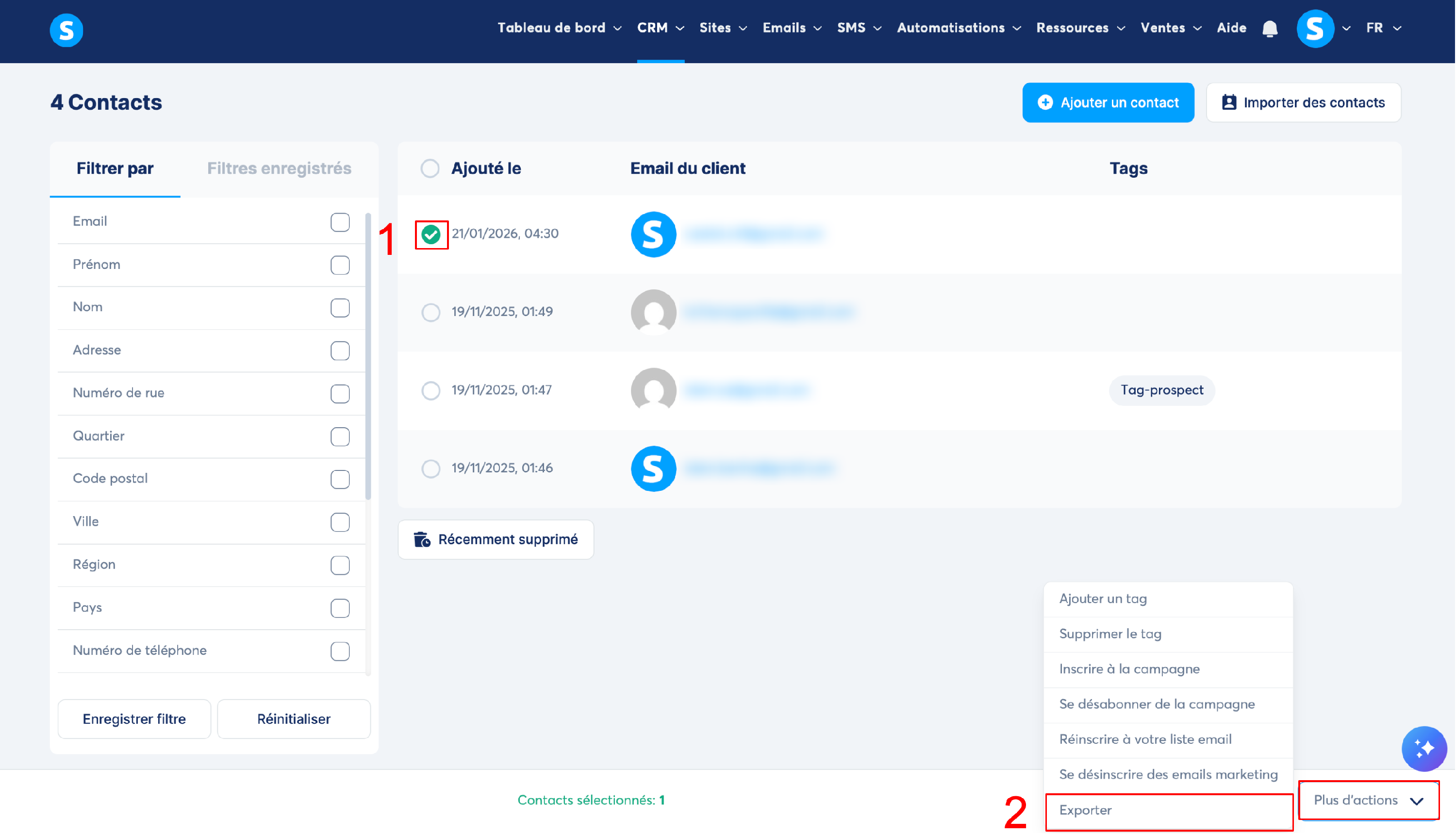 Allez sur votre tableau de bord des contacts et sélectionnez les contacts que vous souhaitez exporter. ( 1 ). Ensuite, cliquez sur "Plus d'actions" en bas à droite, puis sur "Exporter". ( 2 ).