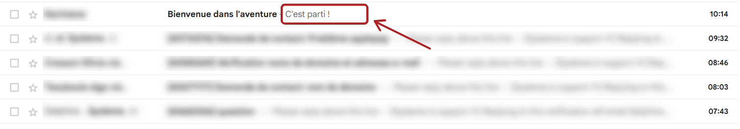 Exemple : l’aperçu de cet email était trop court, Gmail a repris la première ligne du texte de l’email. Le résultat est un peu maladroit et aurait pu être évité avec un aperçu d’email plus long.