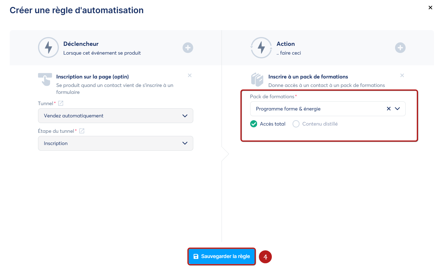 Choisissez le déclencheur "Inscription sur la page (optin)". Sélectionnez ensuite l'action "Inscrire à un pack de formations".