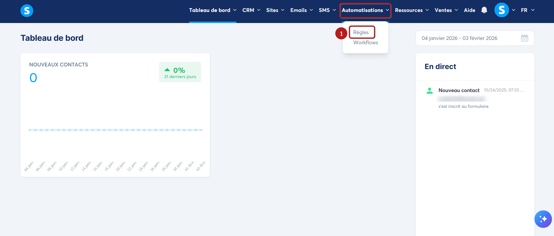 Dans votre menu systeme.io, cliquez sur "Automatisations", puis sur "Règles" (1).