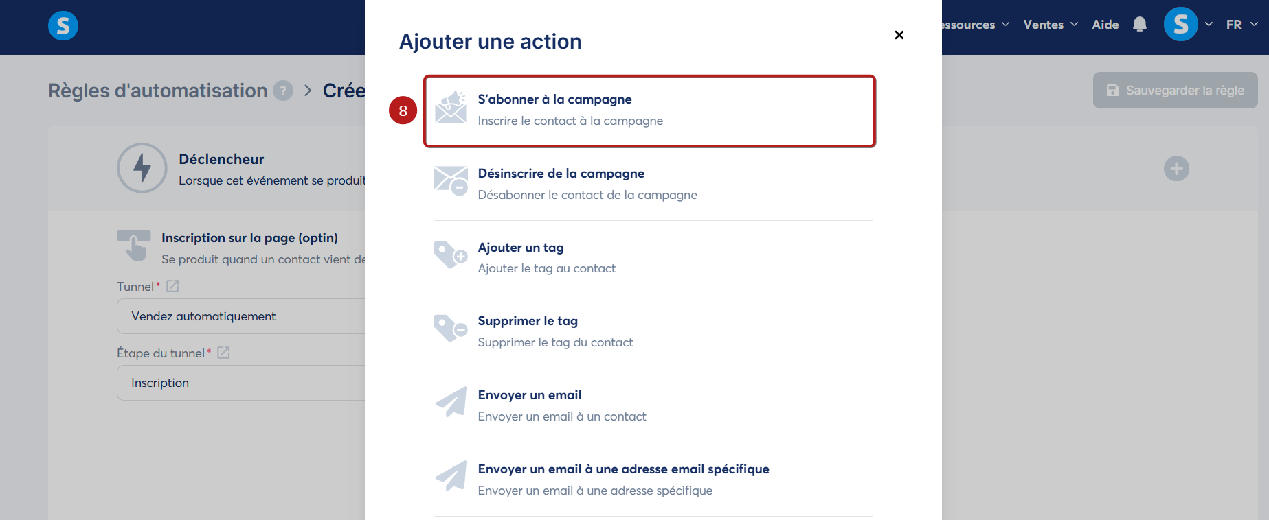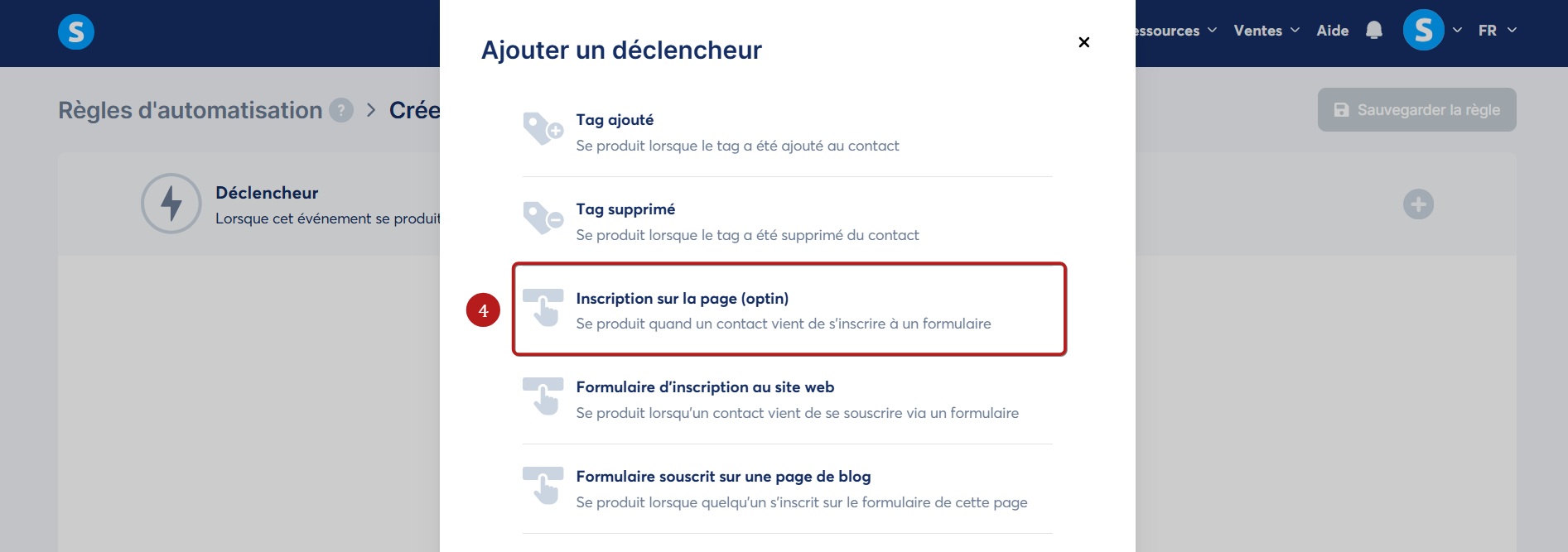 1. Aux prospects inscrits sur la page de capture / formulaire / Popup, choisissez l'option : Inscription sur la page (optin) puis choisissez le titre de votre page (4).