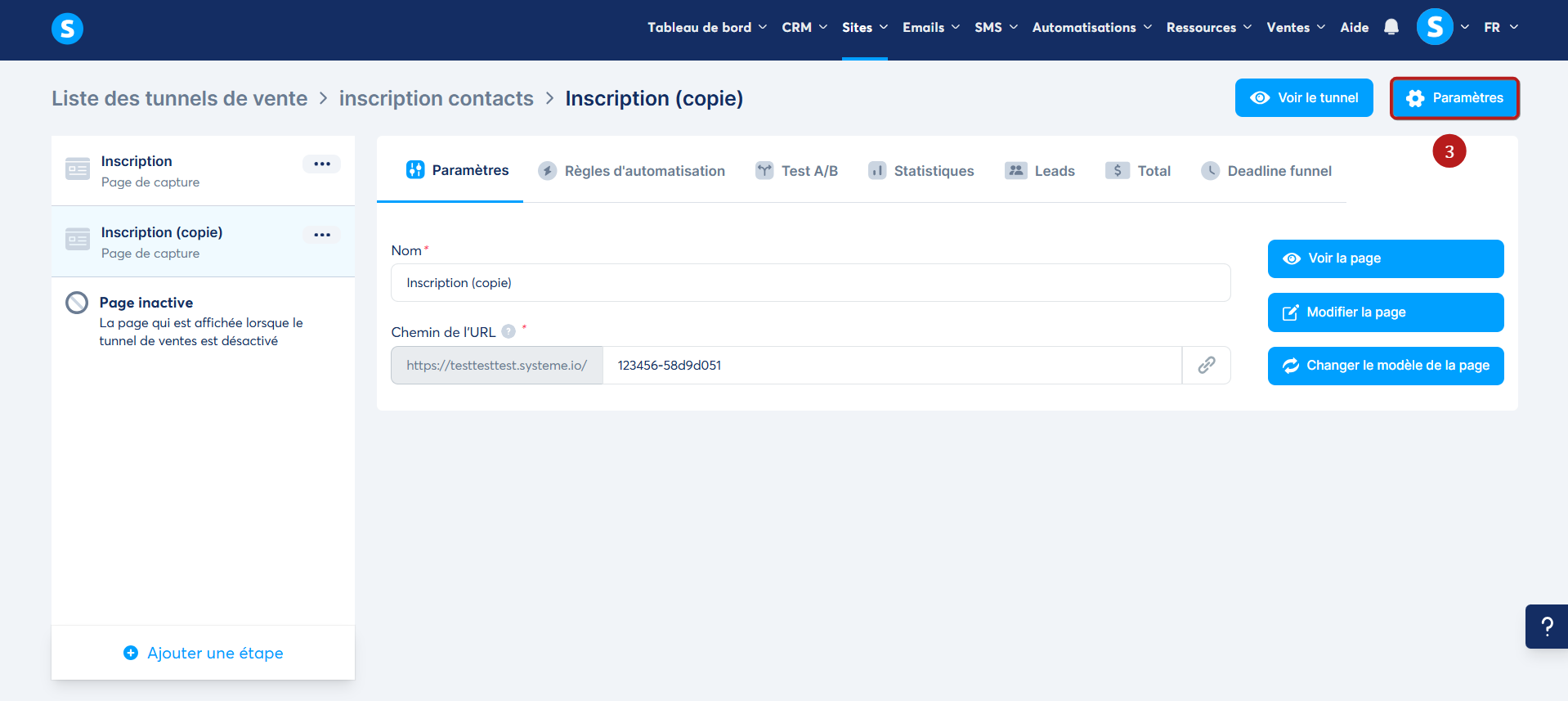 Cliquez ensuite sur le bouton "Paramètres" dans le tunnel de vente (3).