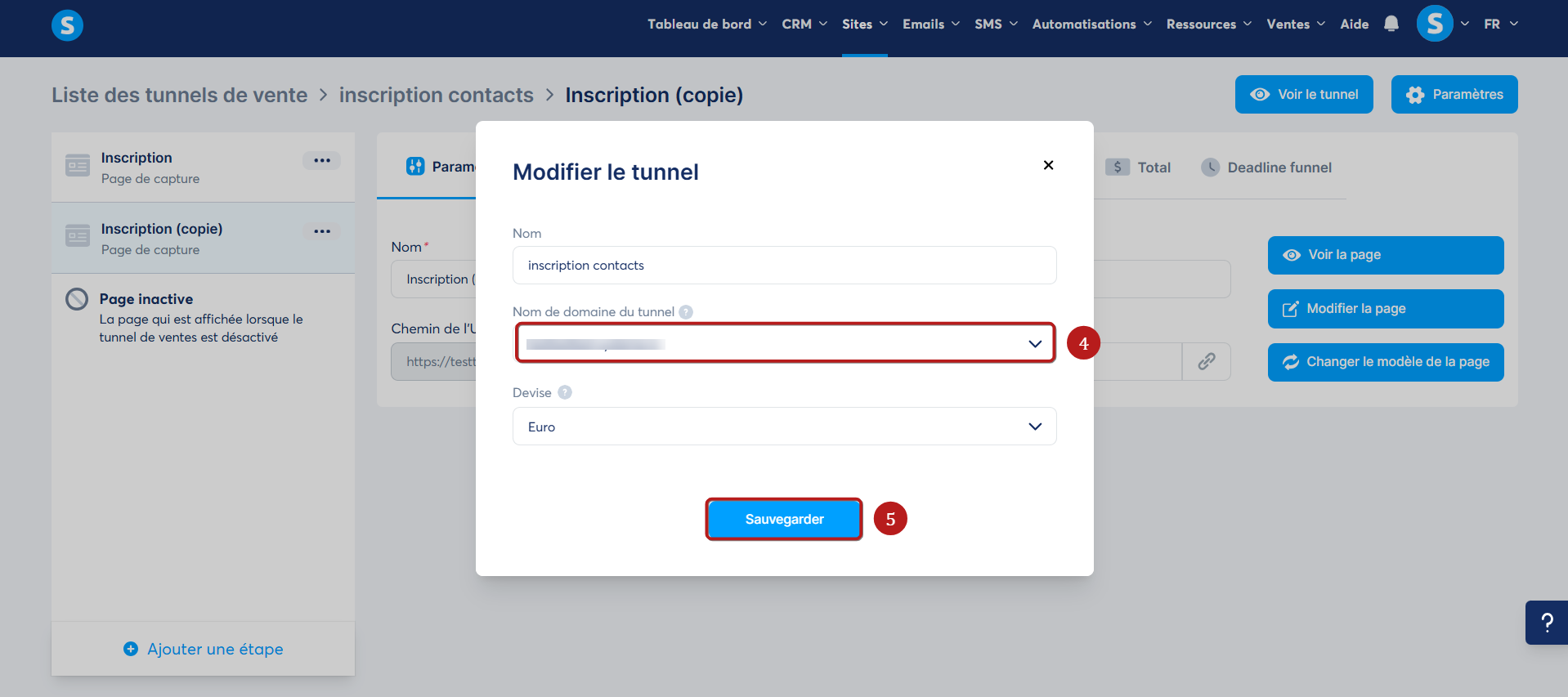 Cliquez sur "Sauvegarder". Les URL des pages de votre tunnel seront automatiquement mises à jour avec le nouveau nom de domaine (5).