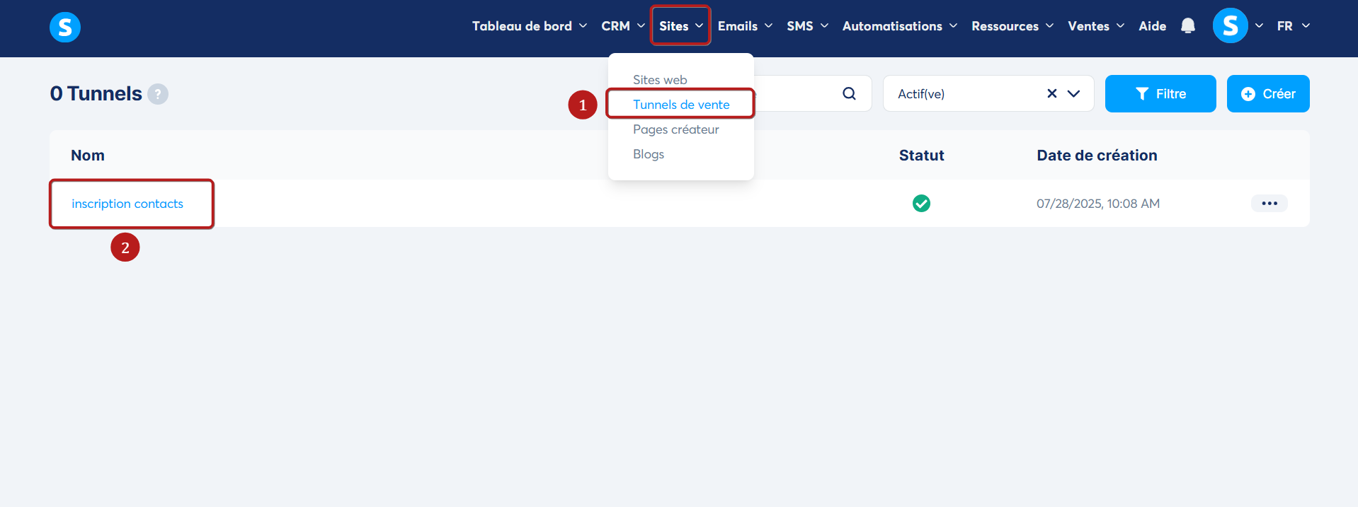 Allez dans l'onglet "Tunnels de vente" (1) et cliquez sur le tunnel de vente dont vous souhaitez modifier le nom de domaine (2).
