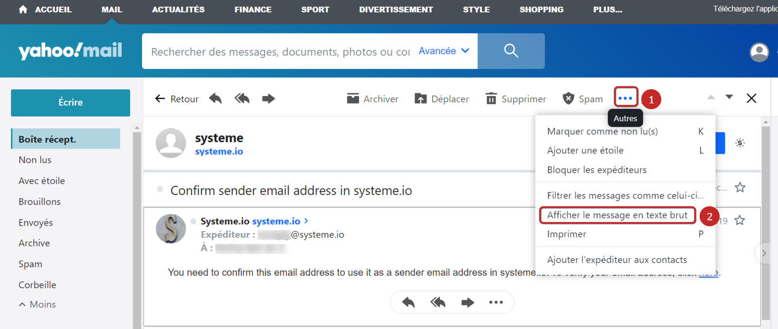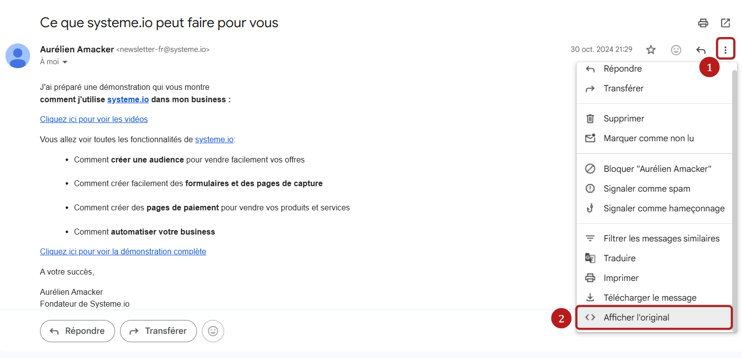 - Sélectionnez "Afficher le message brut" dans le menu (2).