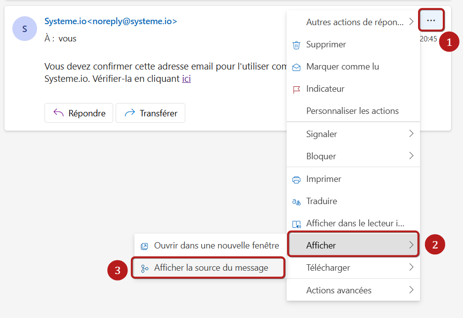 - Sélectionnez ensuite "Afficher la source du message" (3).