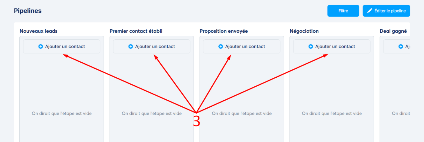 1. Manuellement : vous pouvez ajouter des contacts (existants ou nouveaux) manuellement à n'importe quelle étape du pipeline en vous dirigeant vers l'étape souhaitée, ensuite en cliquant sur "Ajouter un contact" (3).