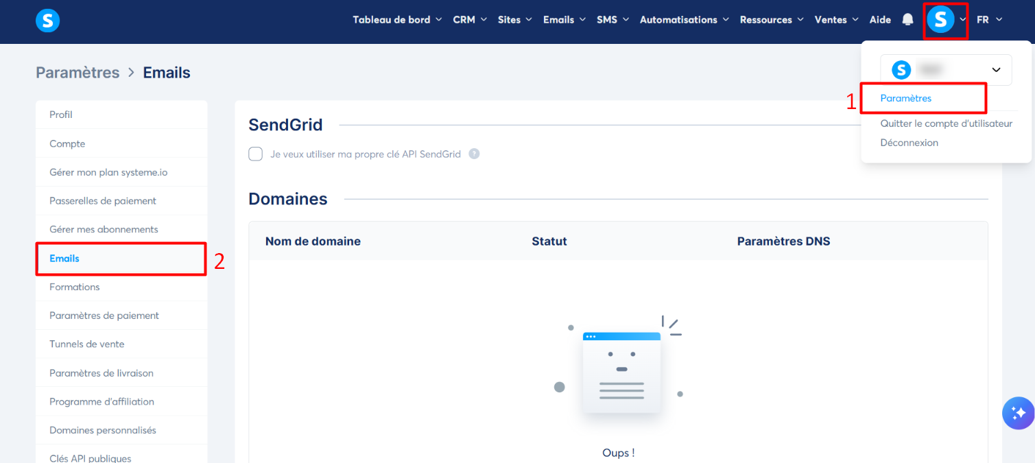 Dirigez-vous vers votre photo de profil et cliquez sur "Paramètres" (1), puis "Emails" (2).