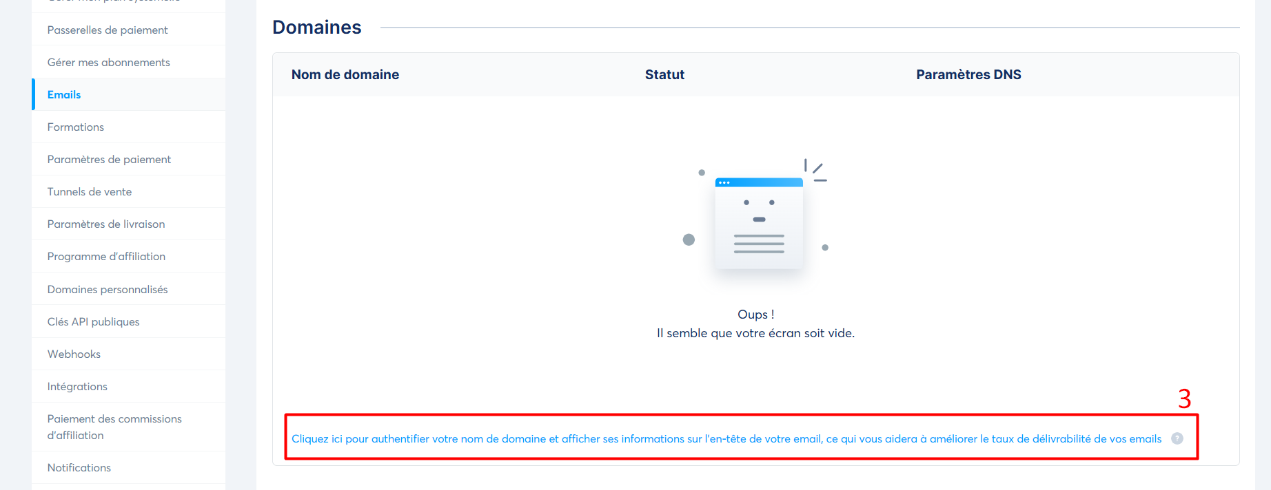 Rendez-vous dans la section "Domaines", puis cliquez sur le lien "Cliquez ici pour authentifier votre nom de domaine et afficher ses informations sur l'en-tête de votre email, ce qui vous aidera à améliorer le taux de délivrabilité de vos emails" (3).