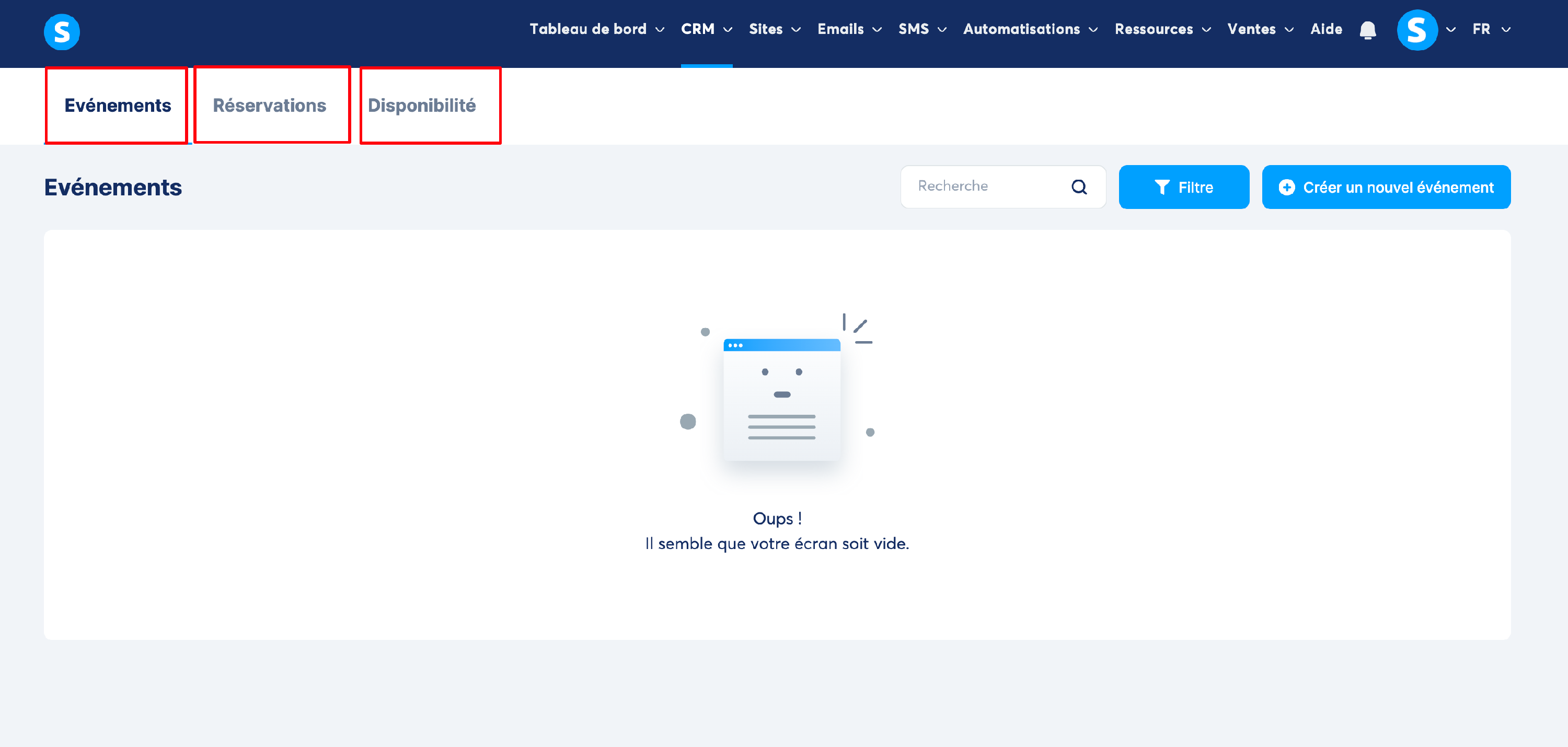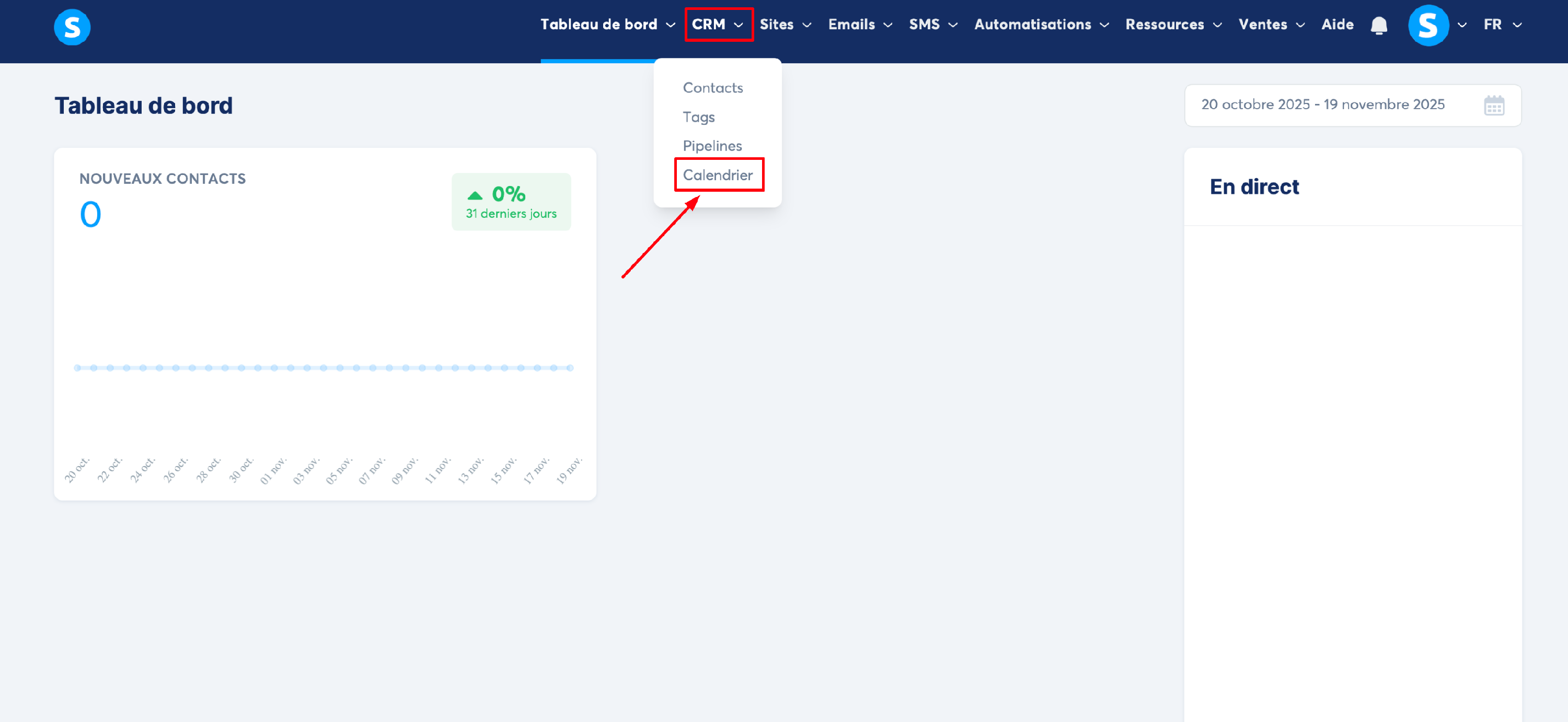 Vous pouvez accéder à la section « Calendrier » depuis le menu « CRM » dans systeme.io.