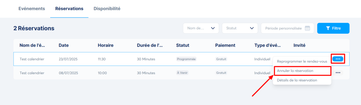 - Annulez une réservation, en cliquant sur "Annuler la réservation" au niveau de la réservation.