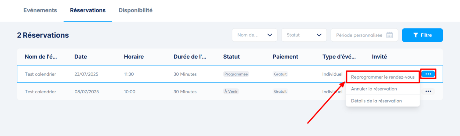 - Reprogrammez une réunion, en cliquant sur "Reprogrammer le rendez-vous"