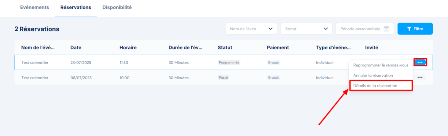 - Cliquez sur « Détails de la réservation » pour afficher les informations de la réservation