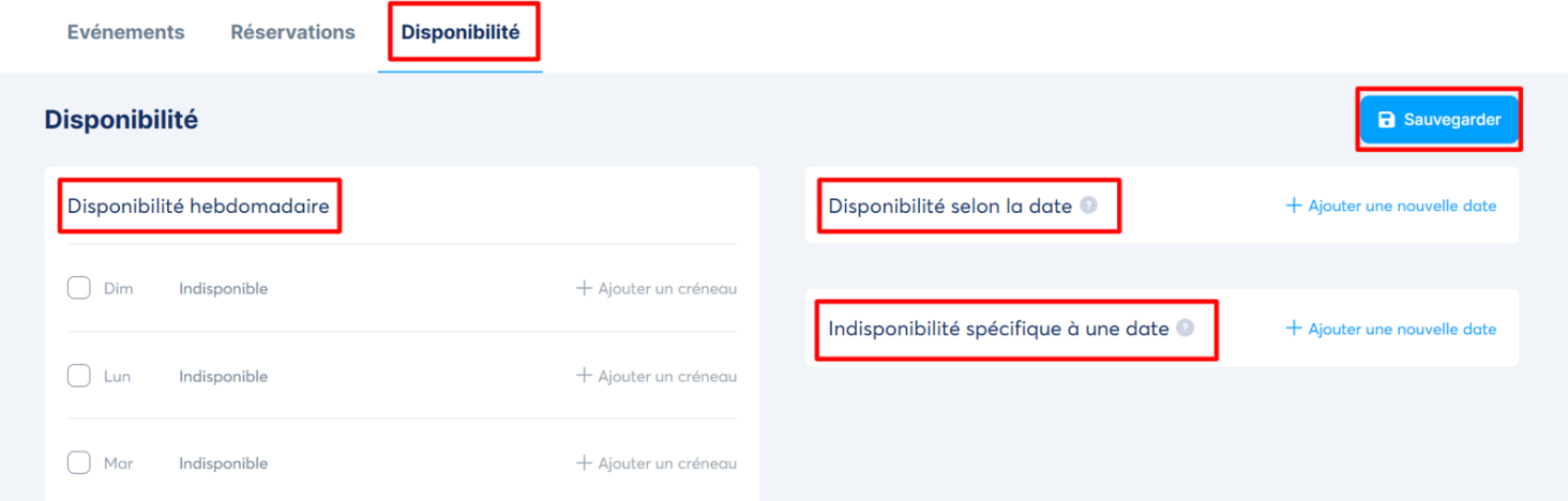 Sur cette page, vous pouvez configurer vos disponibilités globales pour les événements.