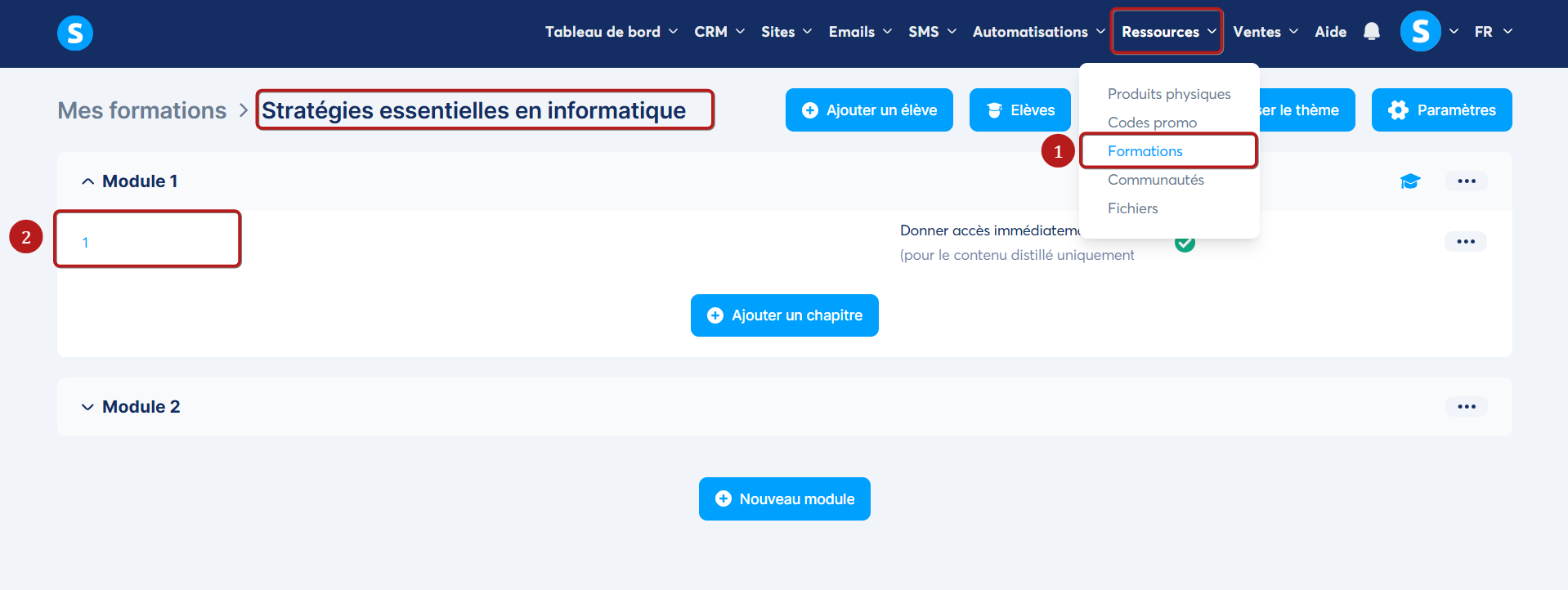 Pour ce faire, rendez-vous dans la formation concernée en cliquant sur "Formations" dans l'onglet "Ressources" (1). Ensuite, dirigez-vous vers le chapitre pour lequel vous souhaitez programmer l'envoi d'un email (2).
