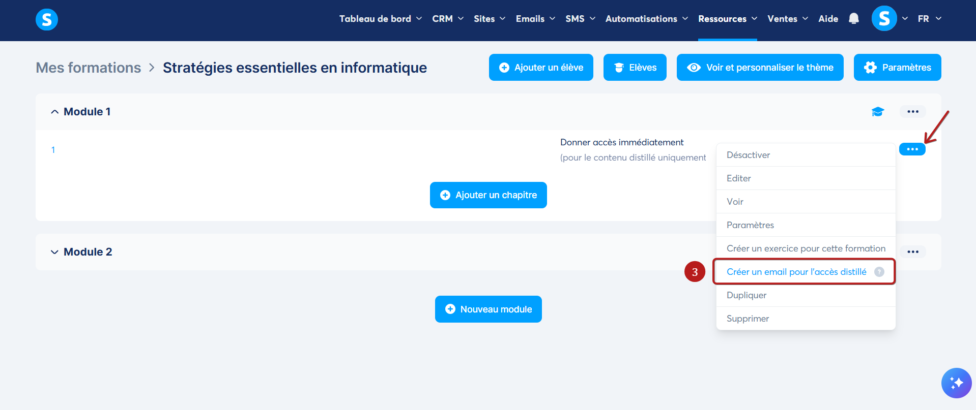 Cliquez sur les trois points situés sur la ligne du chapitre, puis sélectionnez "Créer un email pour l'accès distillé" (3).