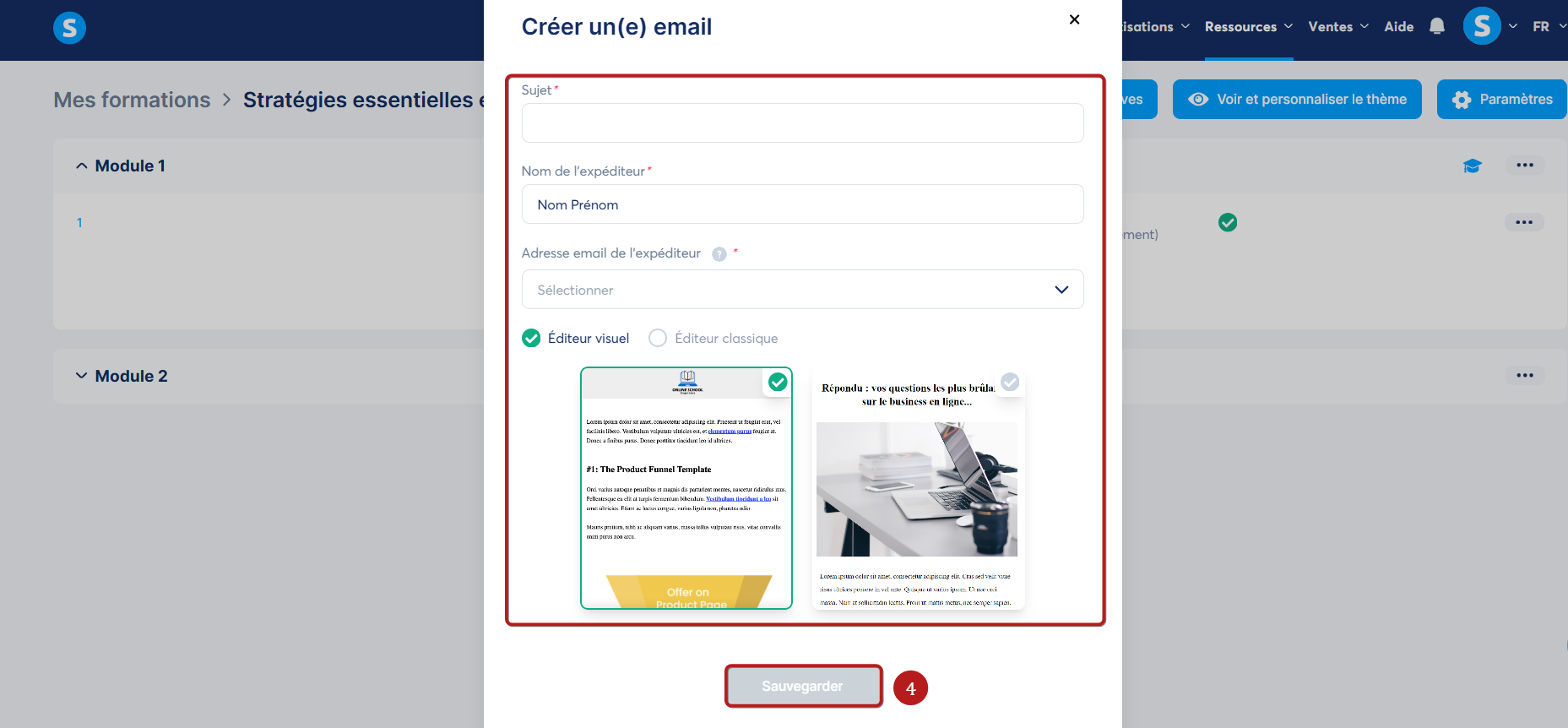 Une fenêtre s'ouvre. Vous devez y renseigner le sujet, le nom et l'adresse de l'expéditeur, puis choisir le type d'éditeur à utiliser ("Éditeur visuel" ou "Éditeur classique"). Cliquez enfin sur "Sauvegarder" (4).