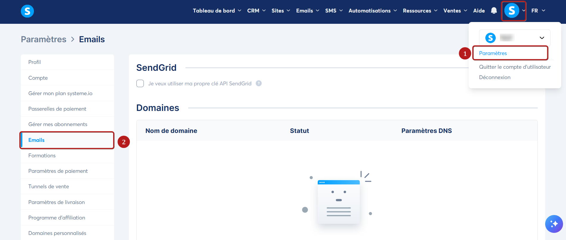 Pour configurer une adresse email, dirigez-vous vers votre menu en cliquant sur votre photo de profil, puis sur "Paramètres" (1) et sélectionnez "Emails" (2).