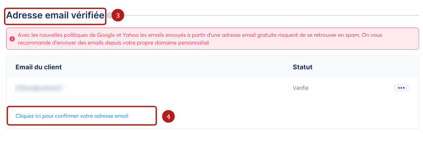 Rendez-vous dans la section "Adresse email vérifiée" (3), puis cliquez sur "Cliquez ici pour confirmer votre adresse email" afin d'ajouter celle de votre choix (4).