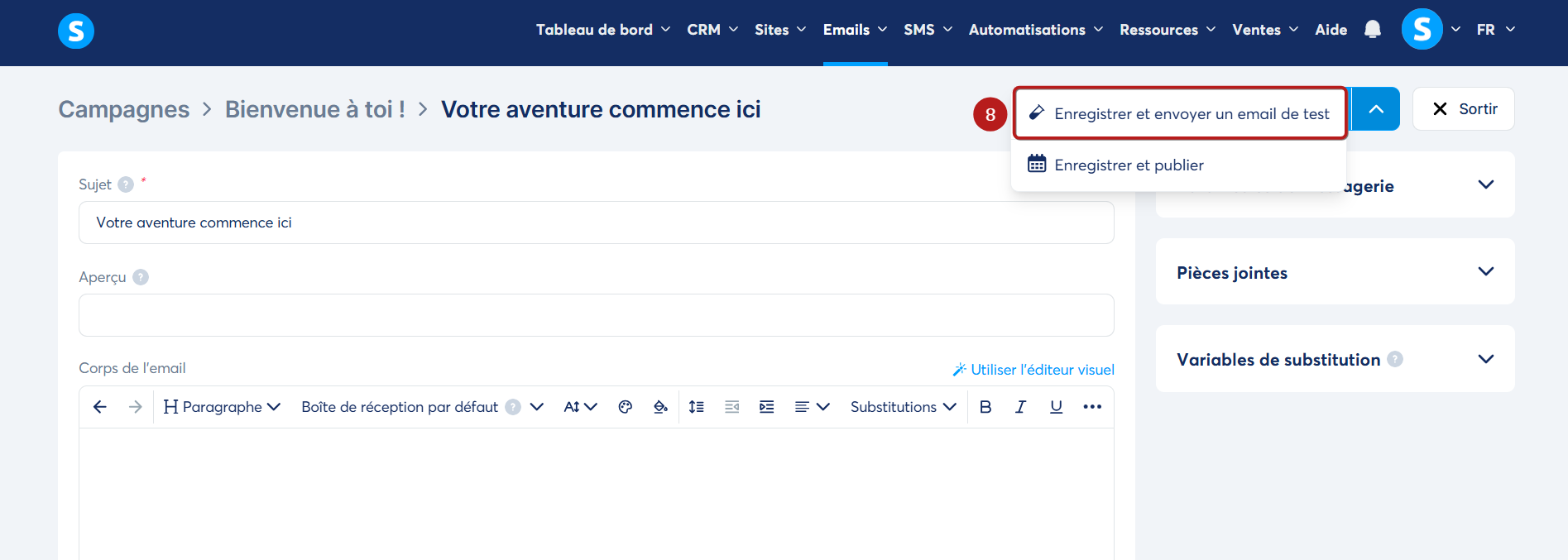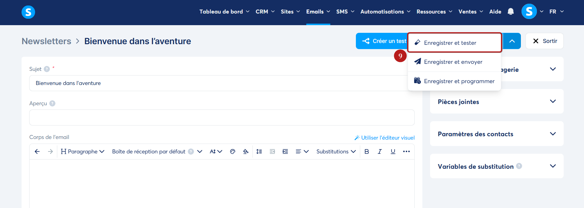 Une fois dans l'éditeur de votre email, cliquez sur le bouton "Enregistrer et tester" (9).