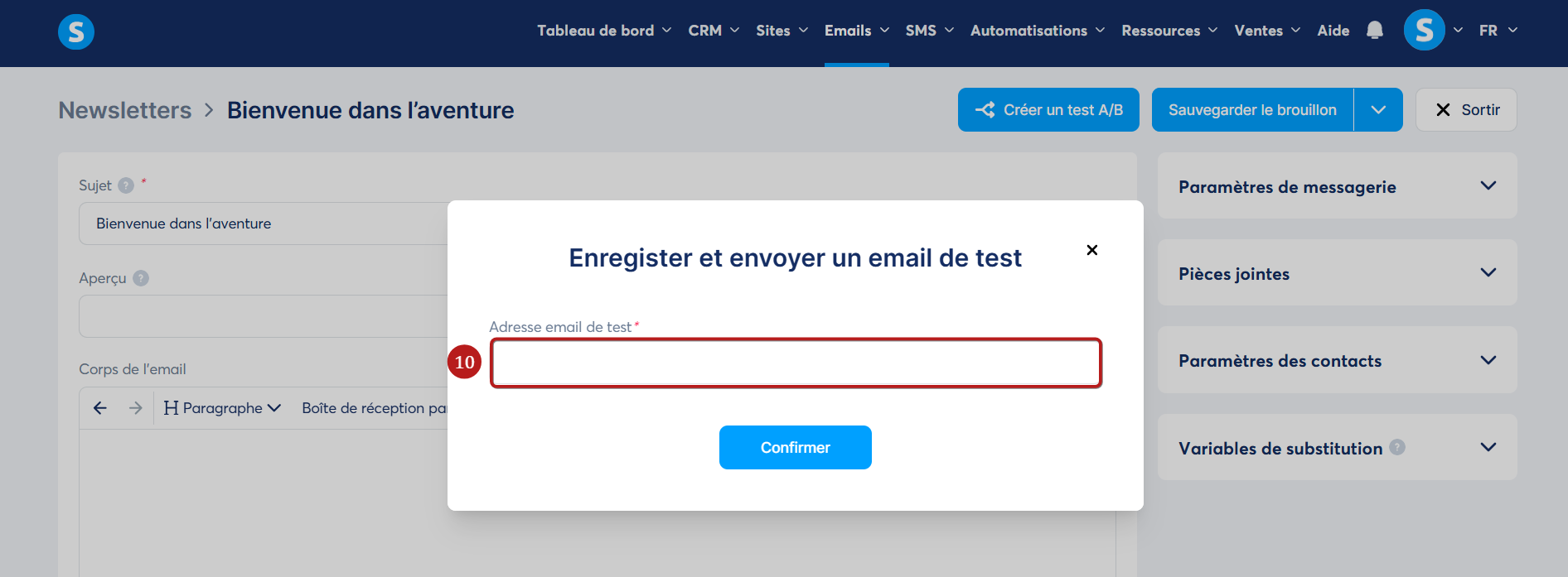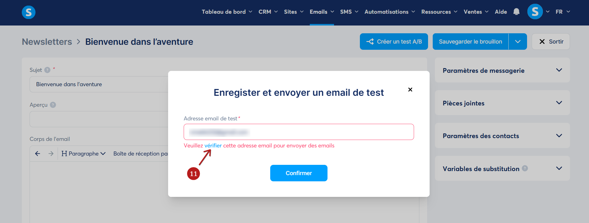 Une popup s'affichera et vous pourrez modifier l'adresse email pour la réception de l'email de test (10).