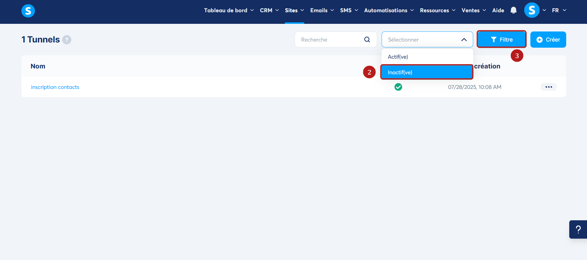 Sélectionnez le filtre "Inactif(ve)'' (2), puis cliquez sur le bouton "Filtre" (3).