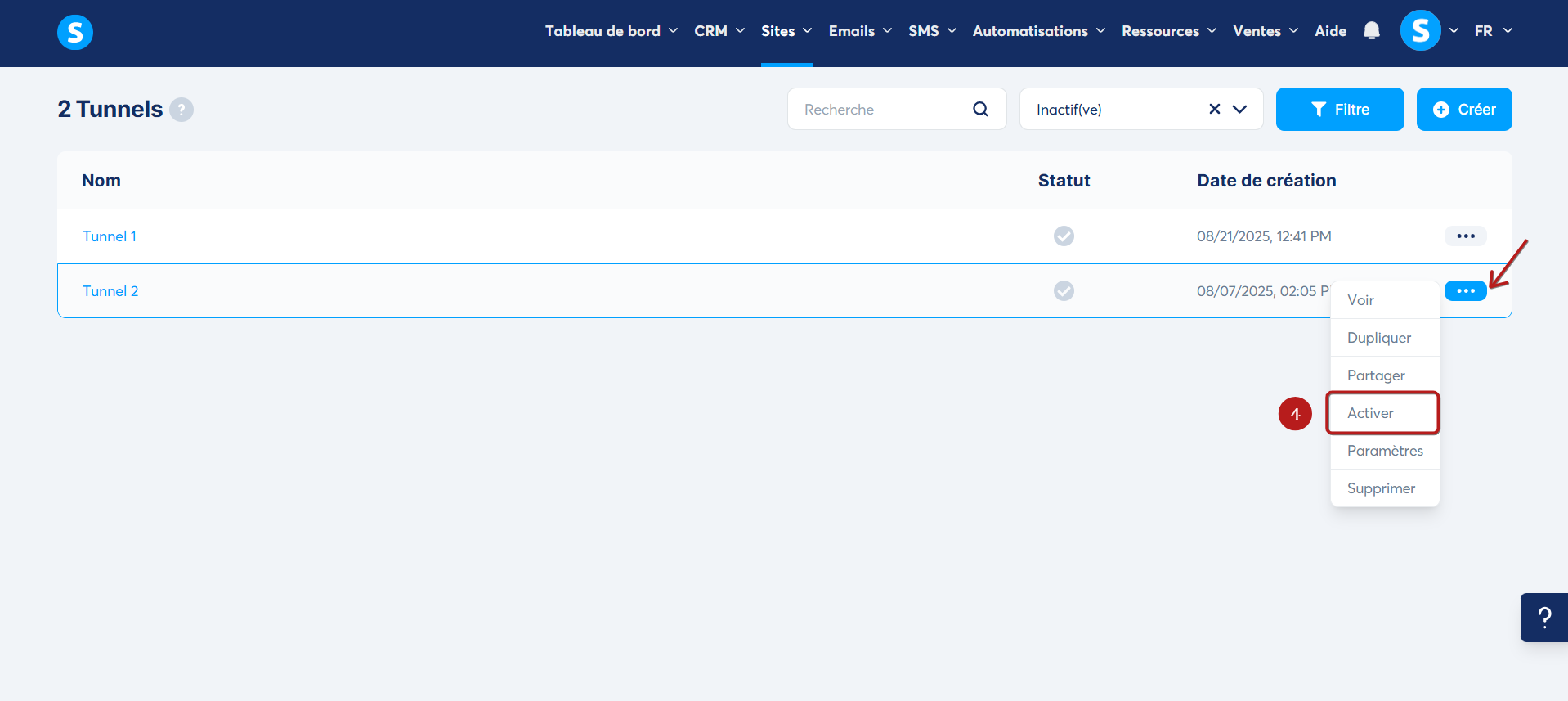 La liste des tunnels inactifs s'affiche. Cliquez sur les trois points, puis sélectionnez "Activer" pour rétablir le tunnel souhaité (4).