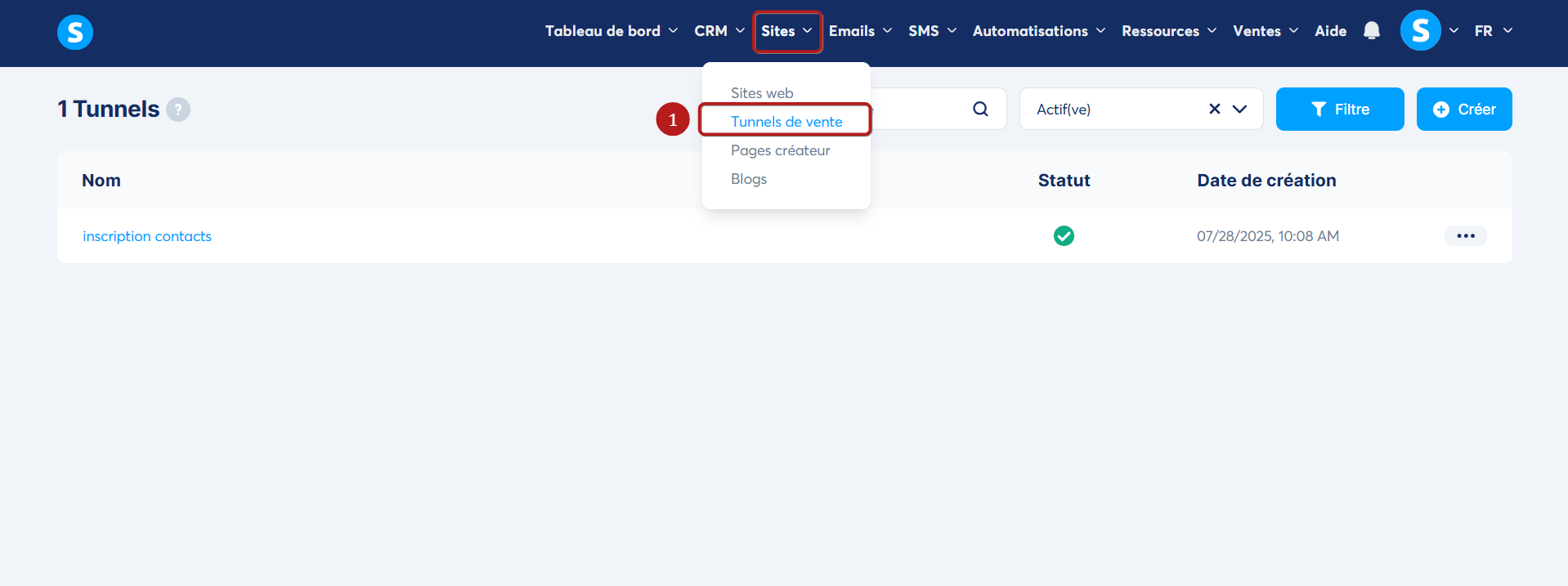 Dans la barre de menu, allez sur l'onglet "Sites" et cliquez sur "Tunnels de vente" (1).