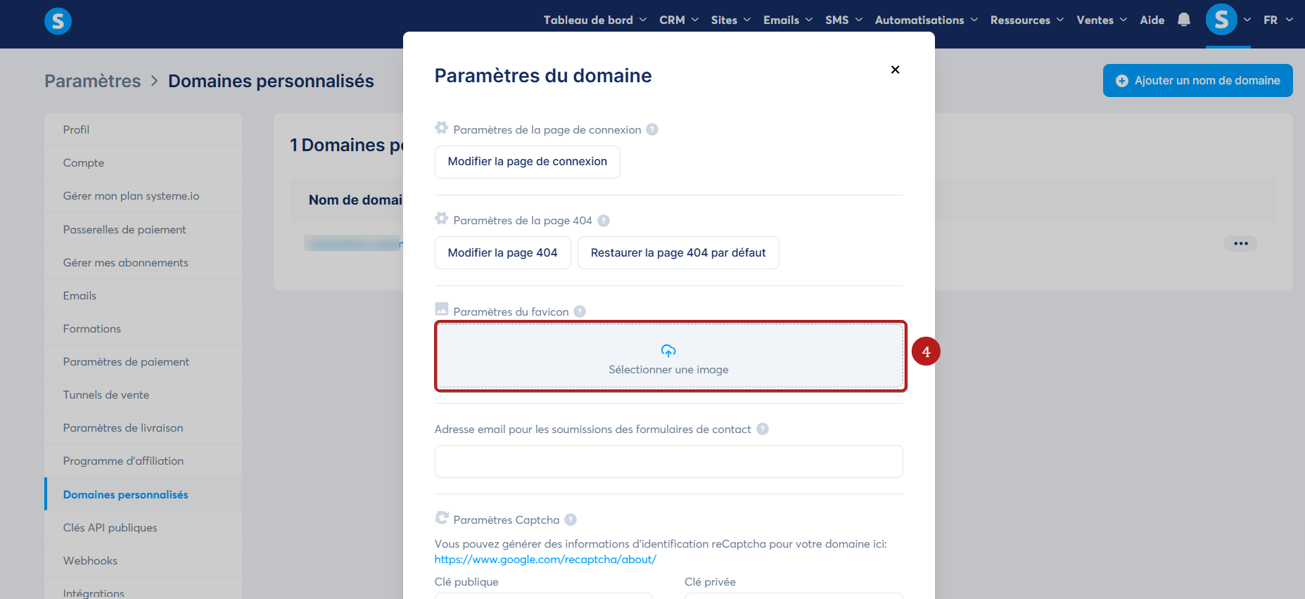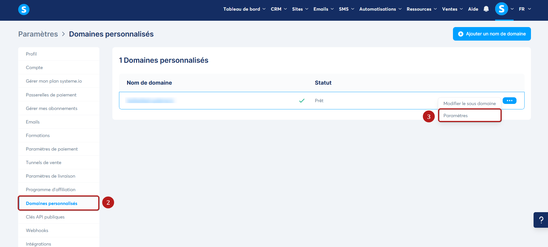 Cliquez sur "Domaines personnalisés" (2). Cliquez ensuite sur les 3 points correspondant au domaine souhaité, puis sélectionnez "Paramètres" pour afficher les paramètres du nom de domaine pour lequel vous souhaitez ajouter votre favicon (3).
