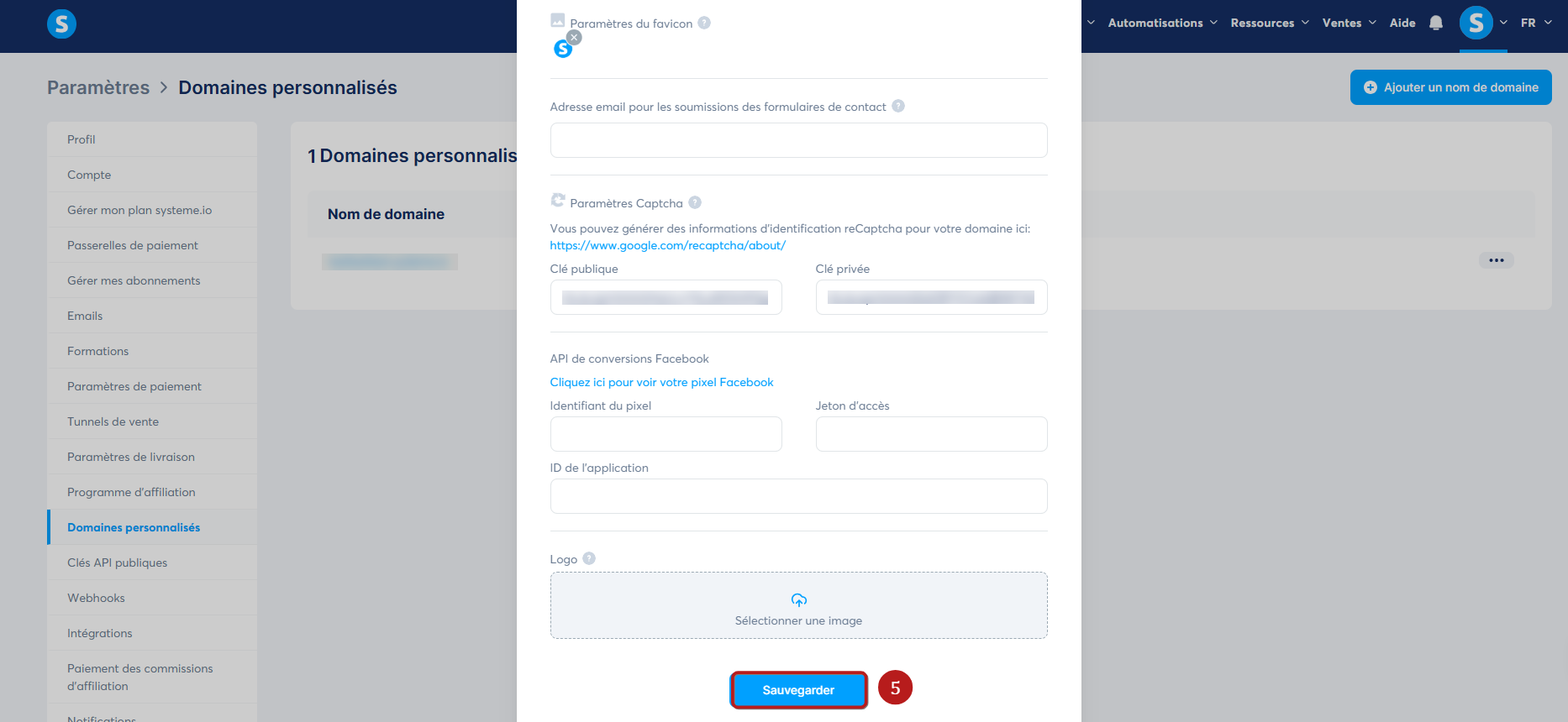 Vous devez ensuite cliquer sur "Sauvegarder" pour enregistrer le favicon (5).