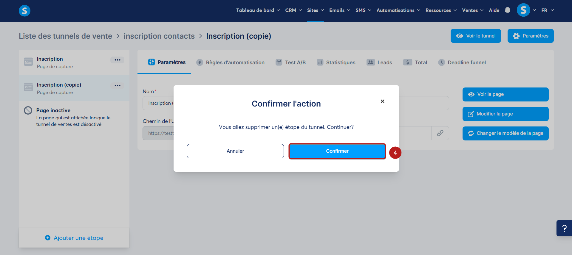 Cliquez sur "Confirmer" (4) pour supprimer la page définitivement de votre tunnel de vente.