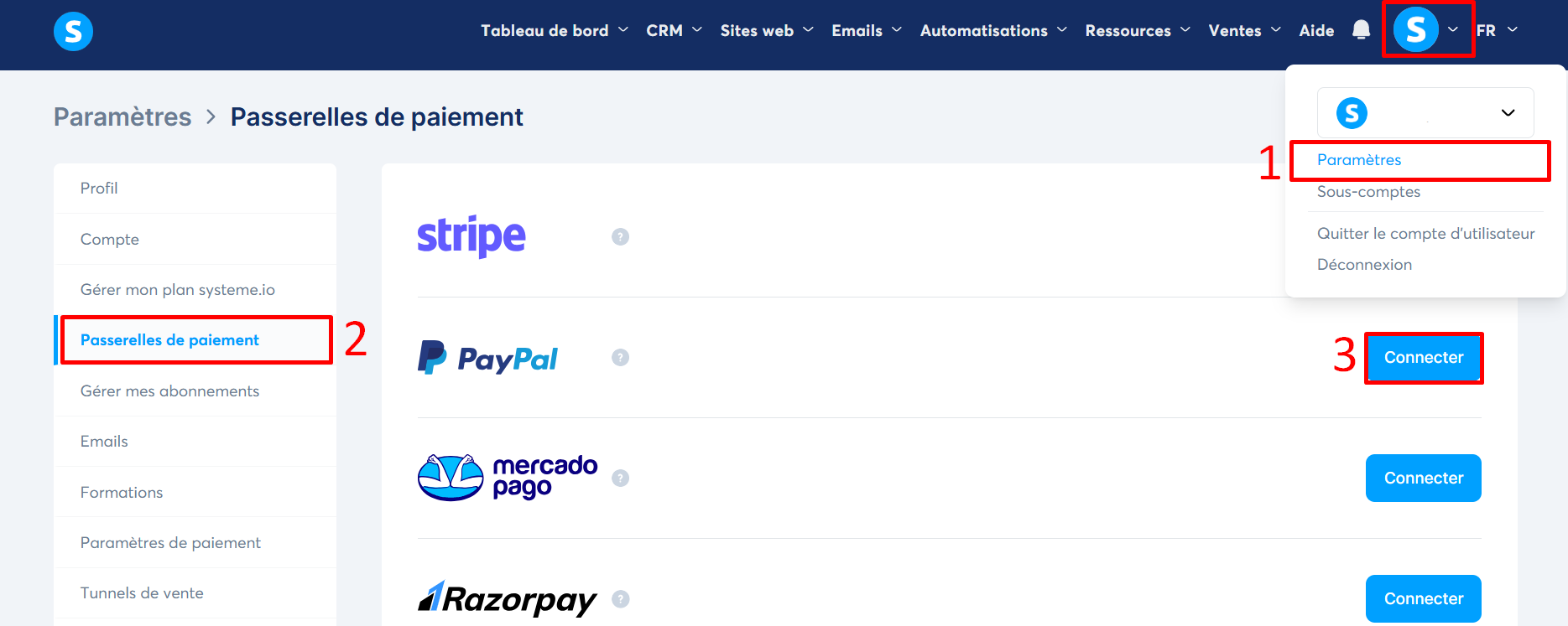 Dans cet article, vous allez voir comment connecter votre compte PayPal à votre compte systeme.io.