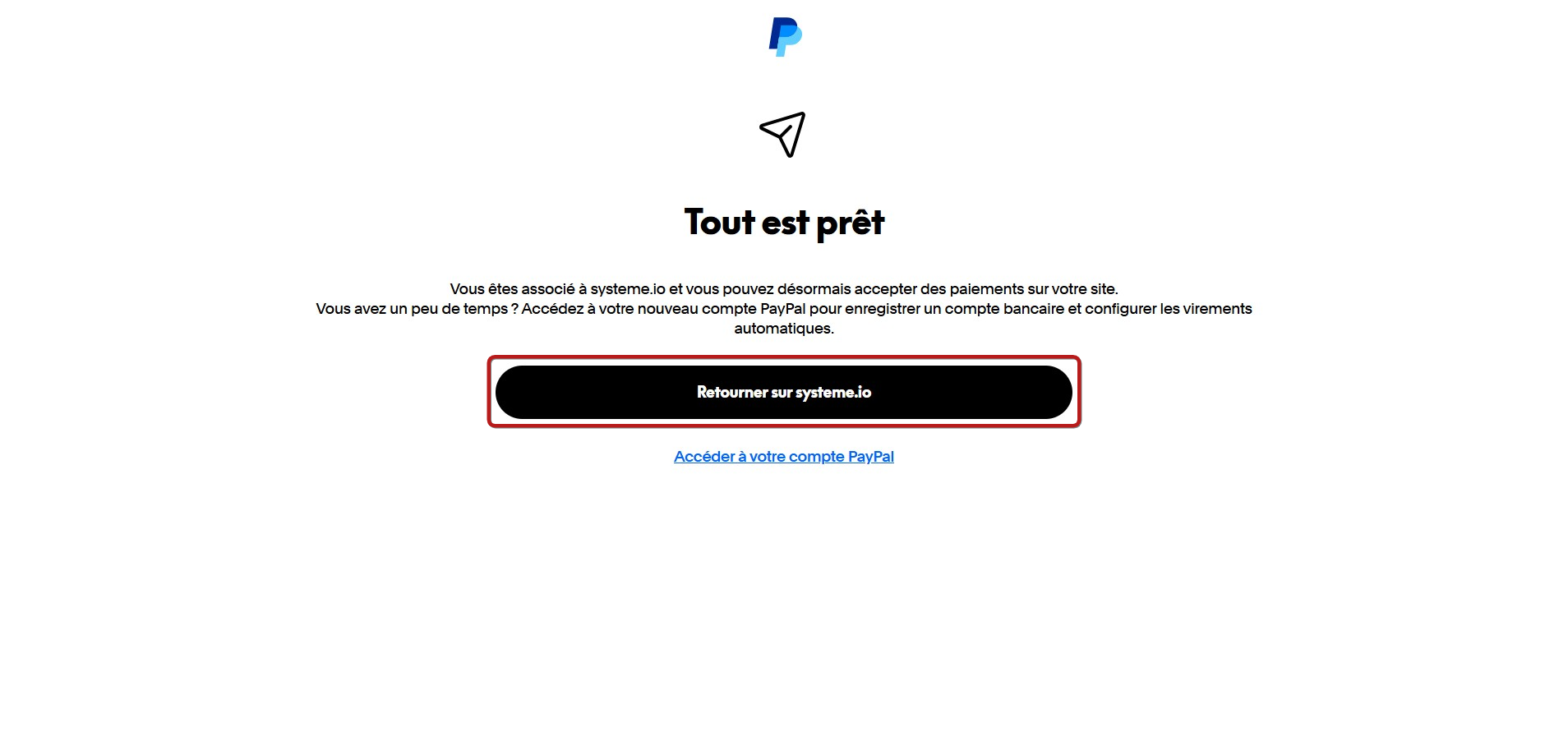 Une fois l'autorisation accordée, PayPal confirmera que la connexion est prête. Cliquez sur « Retourner à systeme.io » pour revenir à votre compte systeme.io