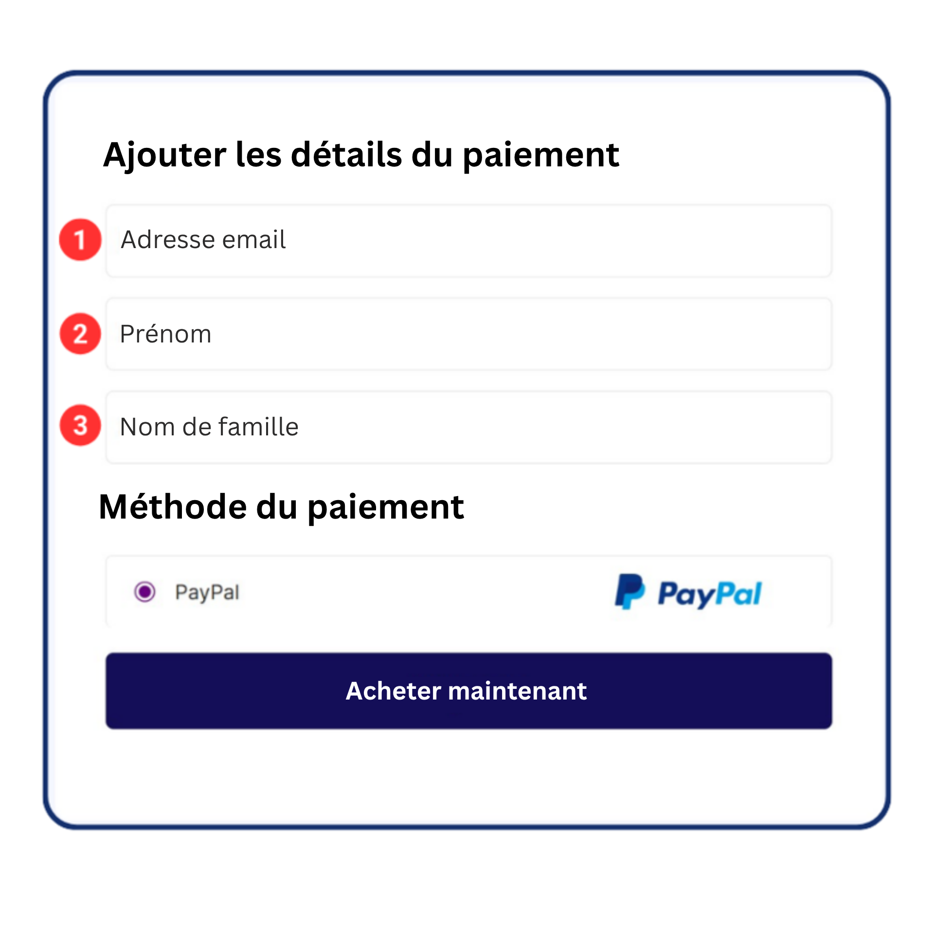 Note : Pour traiter les paiements via PayPal, vous devez ajouter les champs email (1), prénom (2) et nom (3) à tous vos formulaires de commande