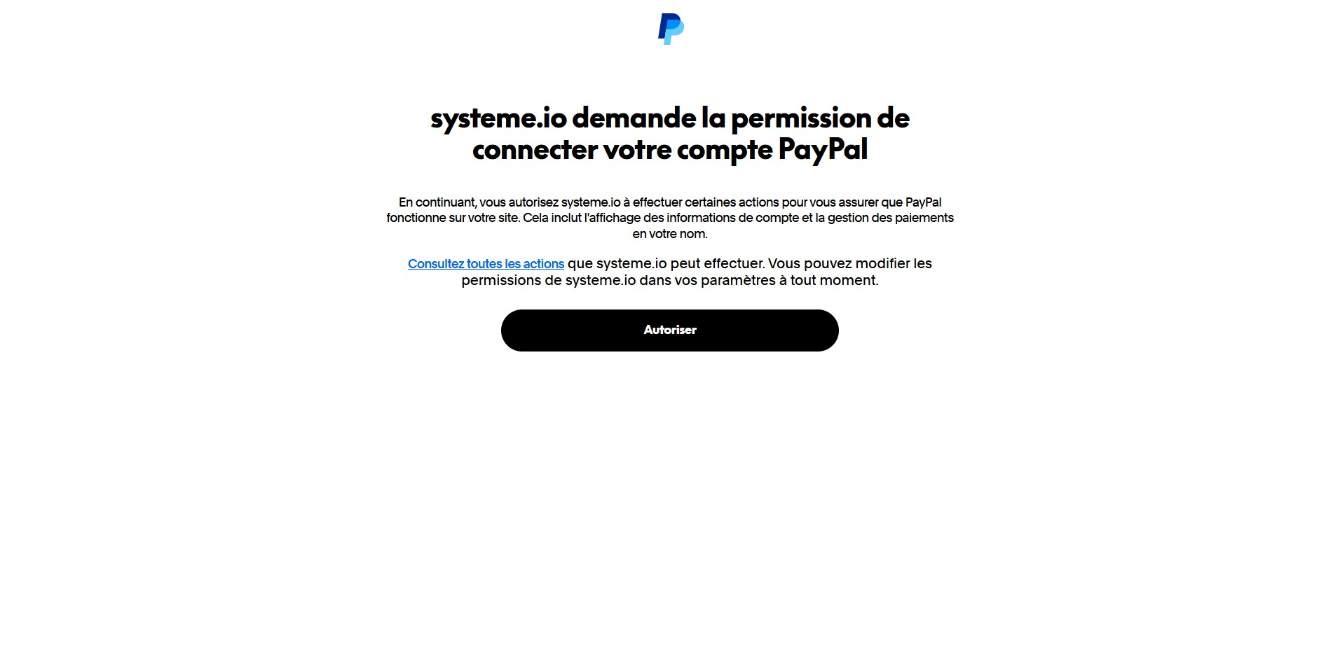 Une fois connecté, PayPal affichera un message vous demandant d'autoriser systeme.io à se connecter à votre compte. Cliquez sur le bouton « Autoriser » pour accorder l'autorisation