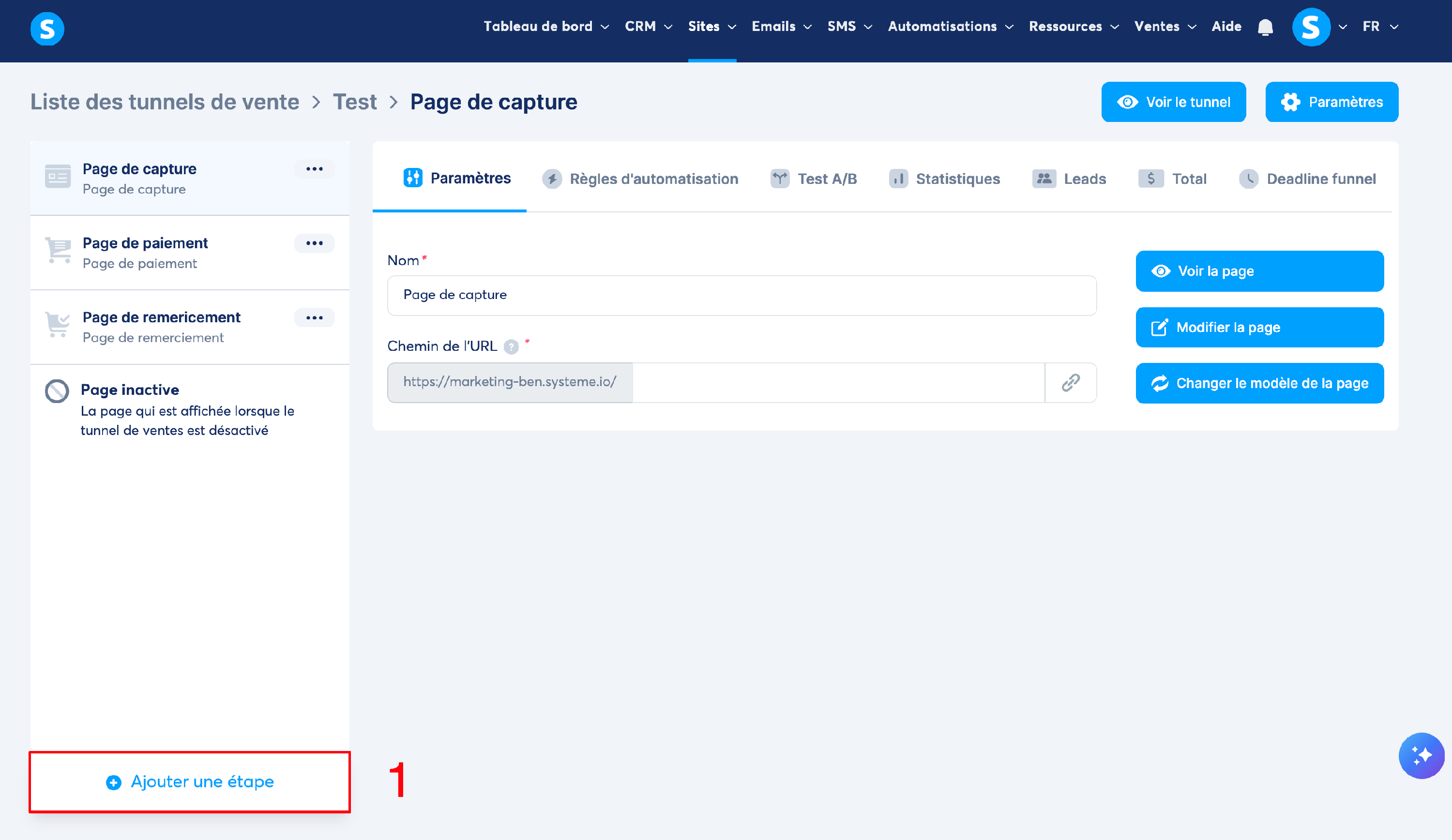 Étape 1 : au niveau de votre tunnel de vente, cliquez sur le bouton "Ajouter une étape" ( 1 ).