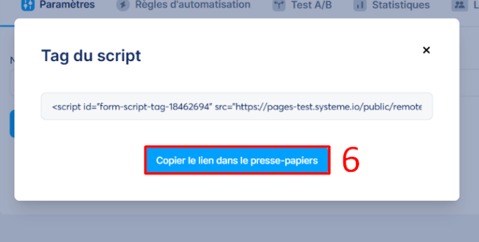 Une popup s'affichera sur laquelle vous devez cliquer sur "Copier le lien dans le presse-papier" pour pouvoir copier le script de votre formulaire (numéro 6 sur l'image).