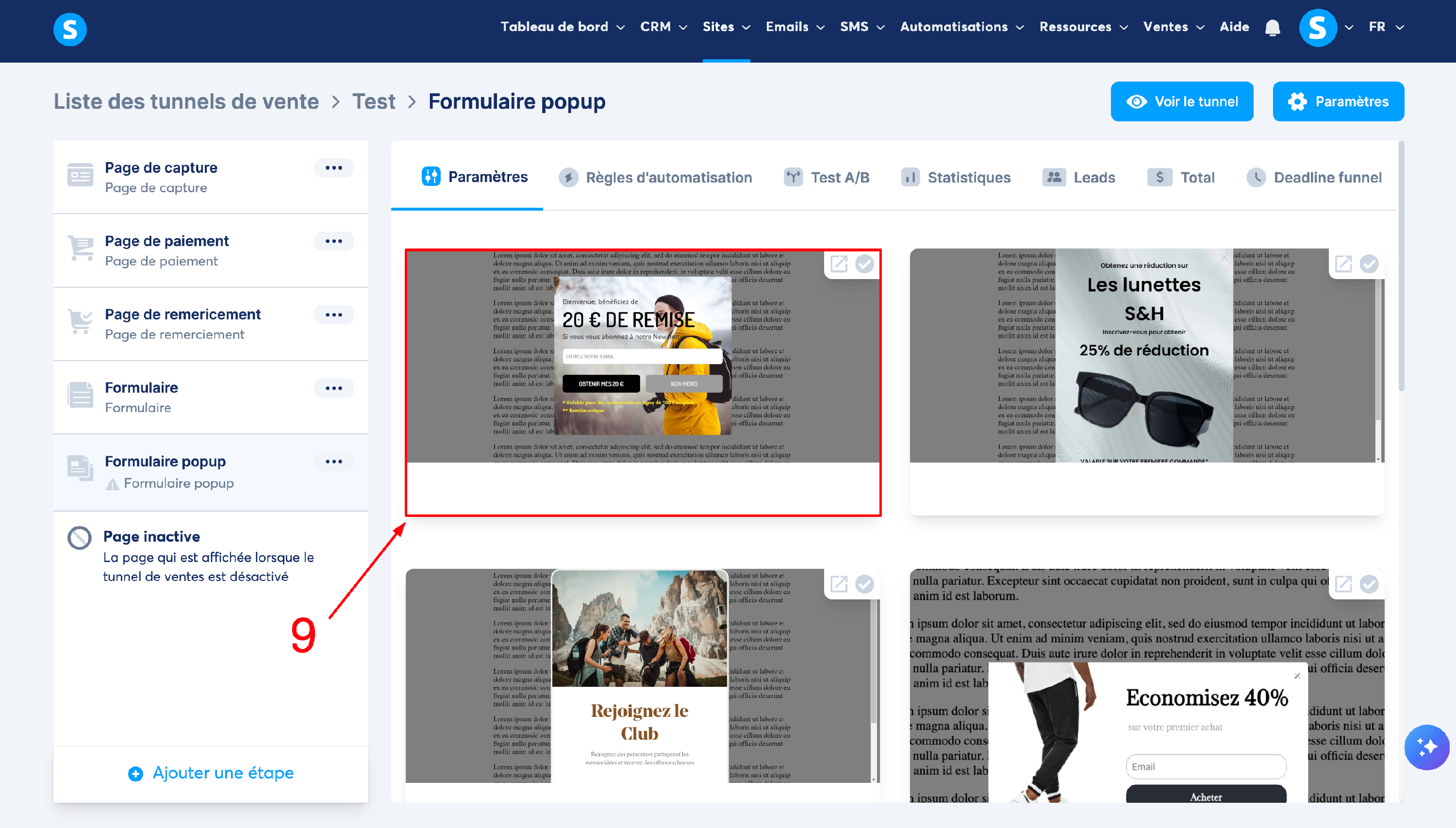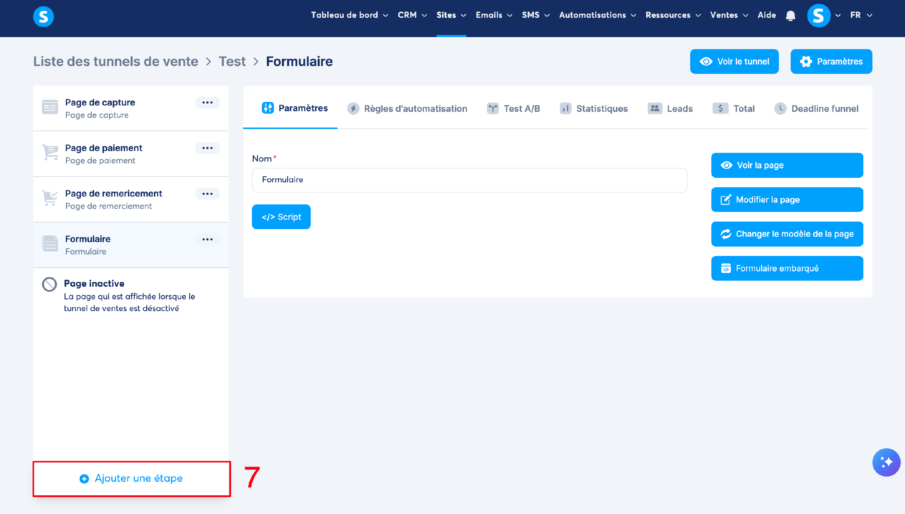 Étape 1 : au niveau de votre tunnel de vente, cliquez sur le bouton "Ajouter une étape" (numéro 7 sur l'image).
