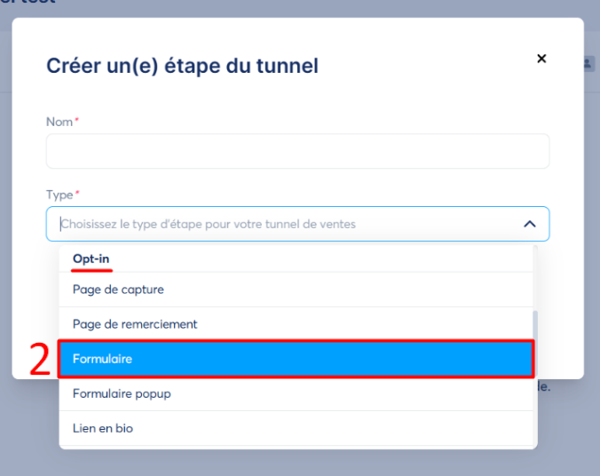 Puis sélectionner "Formulaire" sur le type Opt-in (numéro 2 sur l'image)