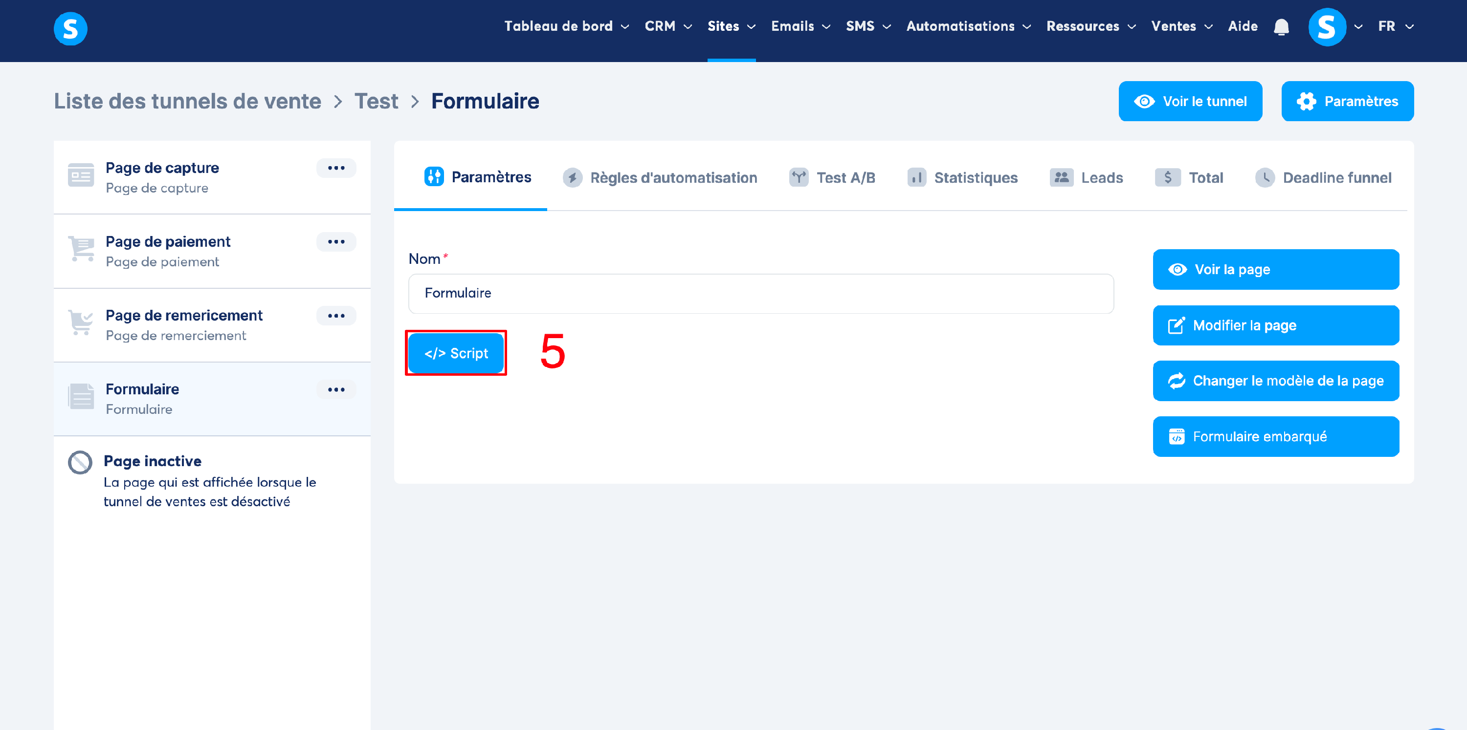 Étape 2 : après avoir terminé la configuration de votre formulaire, pour pouvoir mettre celui-ci sur votre site externe, il vous suffit de copier le Script de votre formulaire en cliquant sur "Script" ( 5 )
