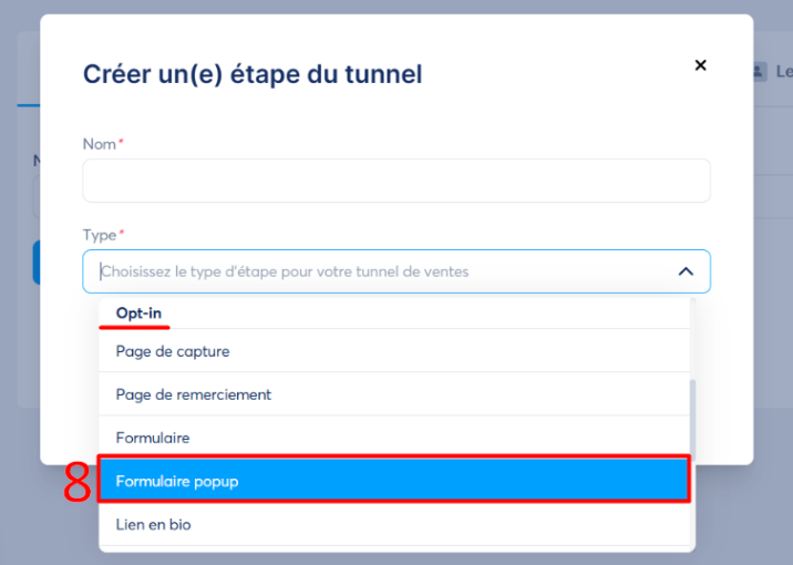 Puis sélectionner "Formulaire popup" sur le type Opt-in (numéro 8 sur l'image)