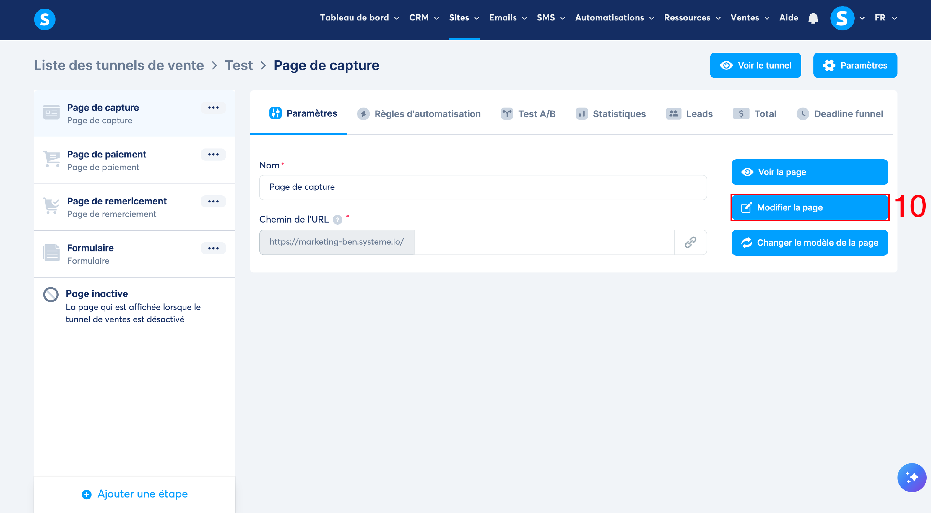 Vous pouvez ensuite modifier votre formulaire popup, en cliquant sur le bouton "Modifier la page" (numéro 10 sur l'image)