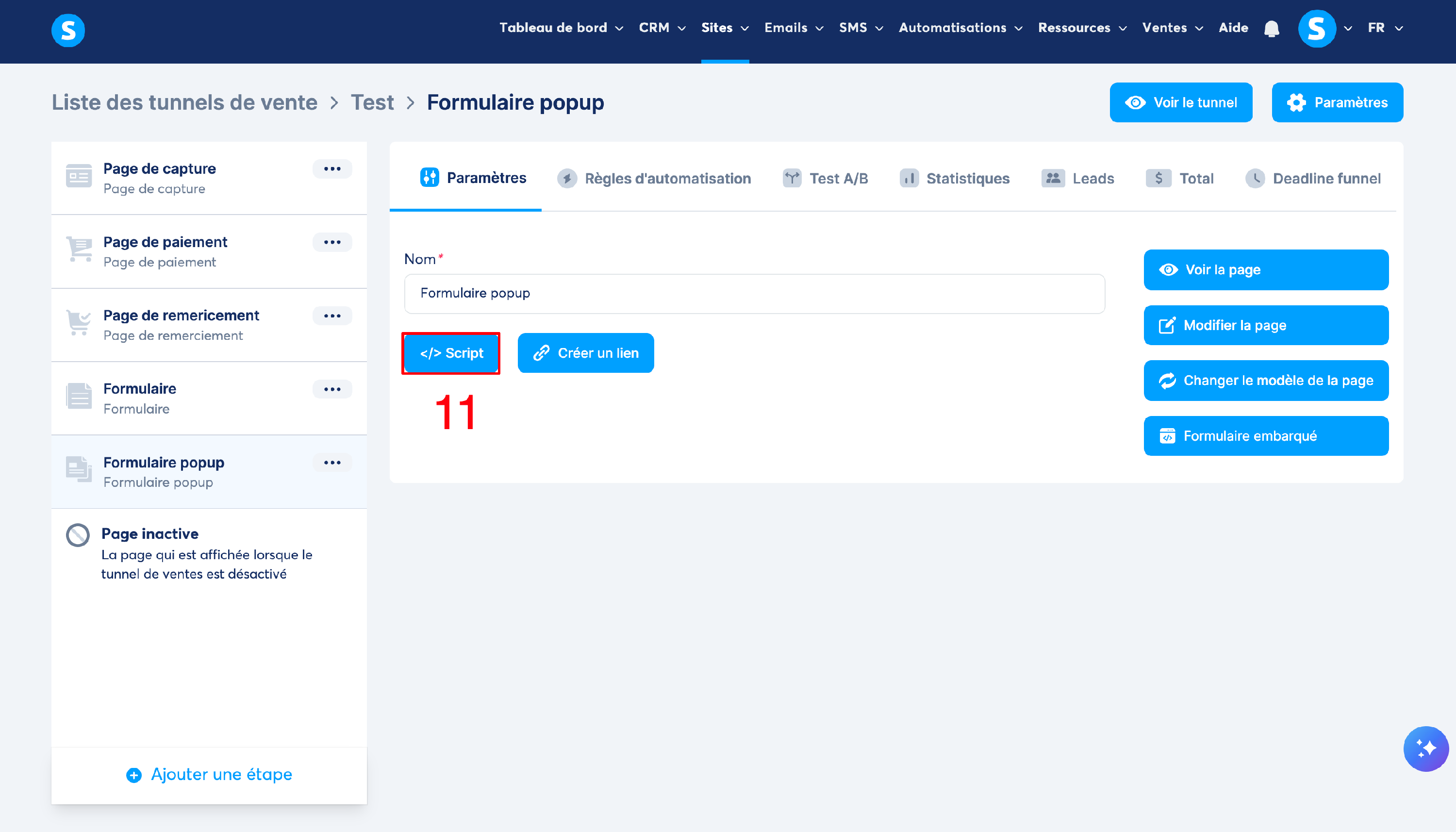Étape 2 : après avoir terminé la configuration de votre formulaire popup, pour pouvoir mettre celui-ci sur votre site externe, il vous suffit de copier le Script de votre formulaire popup en cliquant sur "Script" (numéro 11 sur l'image)