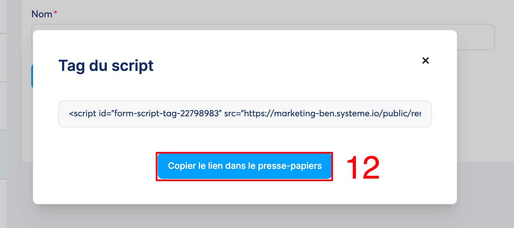 Une popup s'affichera sur laquelle vous devez cliquer sur "Copier le lien dans le presse-papier" pour pouvoir copier le script de votre formulaire popup (numéro 12 sur l'image).